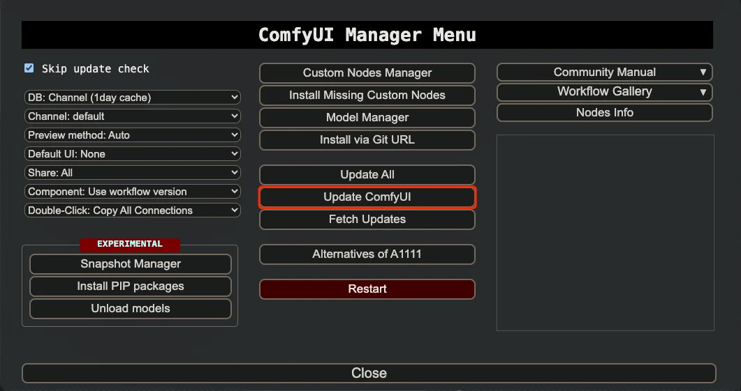 升级完成后,重启 ComfyUI 即可使用新版本。这种方式的好处是可以直接在 ComfyUI 界面内完成升级,不需要切换到外部工具。