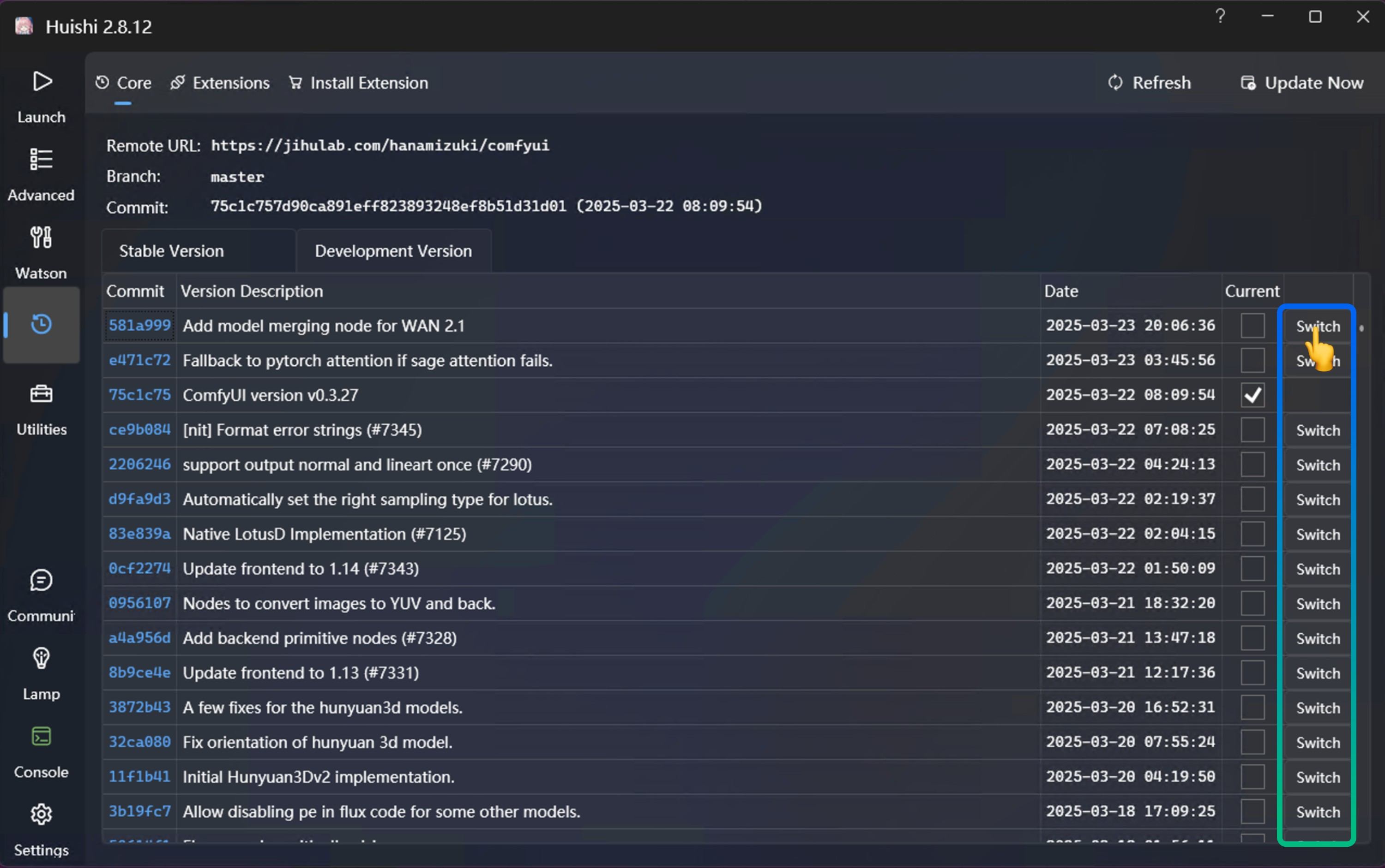 打开秋叶启动器,点击”版本管理”选项。在”内核”选项卡中,你可以看到最新的 ComfyUI 版本和发布日期。