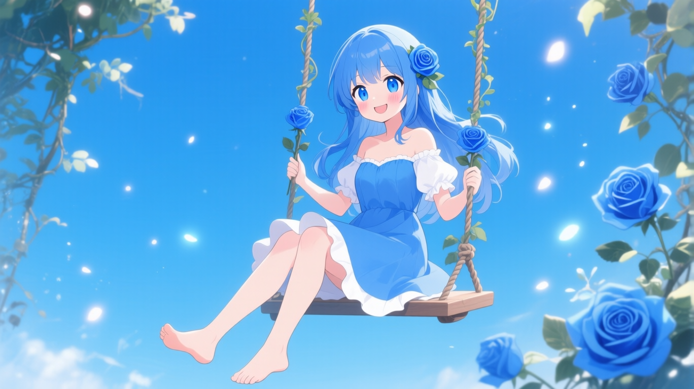 best quality, a cute anime girl, sunshine, soft features, swing, a blue white edged dress, solo, flower, blue eyes, blush, blue flower, long hair, barefoot, sitting, looking at viewer, blue rose, blue theme, rose, light particles, pale skin, blue background, off shoulder, full body, smile, collarbone, long hair, blue hair, vines, plants,最佳质量,可爱动漫少女,阳光,柔和线条,秋千,蓝白滚边连衣裙,单人,花朵,蓝眼,脸红,蓝色花朵,长发,赤脚,坐姿,注视观众,蓝玫瑰,蓝色主题,玫瑰,光粒子,苍白肌肤,蓝色背景,露肩,全身,微笑,锁骨,长发,蓝发,藤蔓,植物