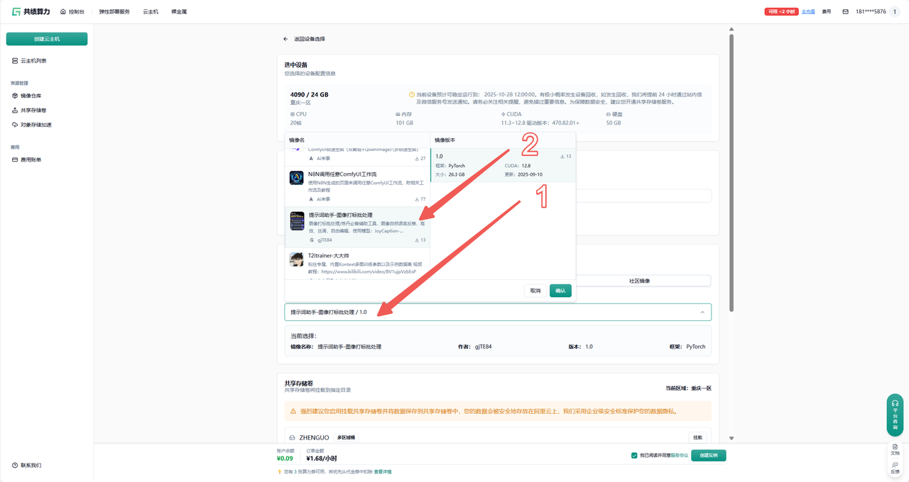 在共绩算力控制台中选择云主机,创建云主机——选择社区镜像——选择提示词助手—图象打标批处理