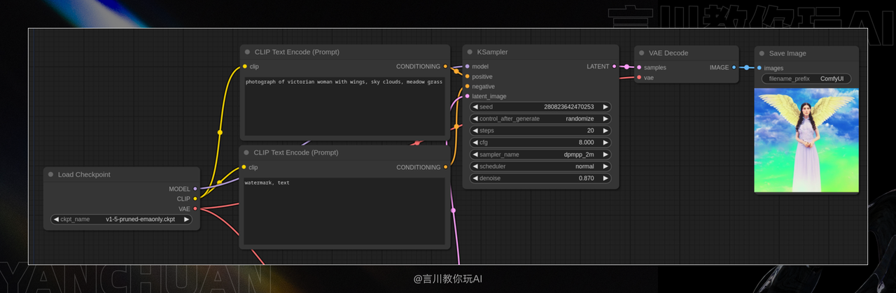 ComfyUI 是一个基于节点的图形用户界面(GUI),最初专为 Stable Diffusion 设计,但如今支持广泛的 AI 图像生成模型,包括 Stable Diffusion 的各种变体如 SD 1.5 和 SDXL,以及 Flux、自定义微调模型等。它专注于提升图像生成的生产力和灵活性,通过将复杂过程分解为可连接的节点块,用户可以轻松构建自定义工作流程,这些节点涵盖从模型加载、提示词编码、采样过程到后处理的所有环节,例如加载 checkpoint 模型、输入正面和负面提示、选择采样器和步骤数等。不同于传统的线性界面,ComfyUI 的节点式设计允许用户可视化地链接不同组件,实现高度可控的生成路径,这使得它特别适合扩散模型架构,能够优化资源利用并支持扩展插件。实际上,ComfyUI 不仅仅是一个运行界面,更是专业级的 AI 图像生成工具链,借鉴了如 Blender、Unreal Engine 和 DaVinci Resolve 等专业软件的节点工作流范式,帮助用户从简单测试到复杂艺术创作无缝过渡。作为开源项目,ComfyUI 由社区驱动,官方仓库提供详细文档和示例:https://github.com/comfyanonymous/ComfyUI?tab=readme-ov-file。它通过节点扩展集成 LoRA、ControlNet 等高级功能,并兼容多种模型来源,适用于从初学者到 AI 研究者的各种需求。