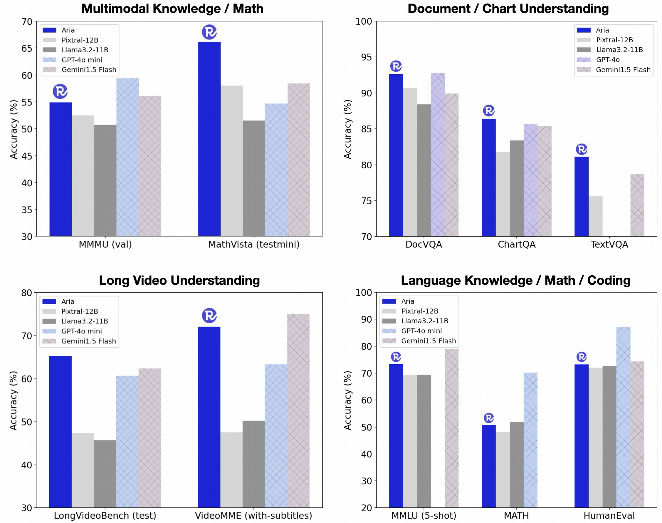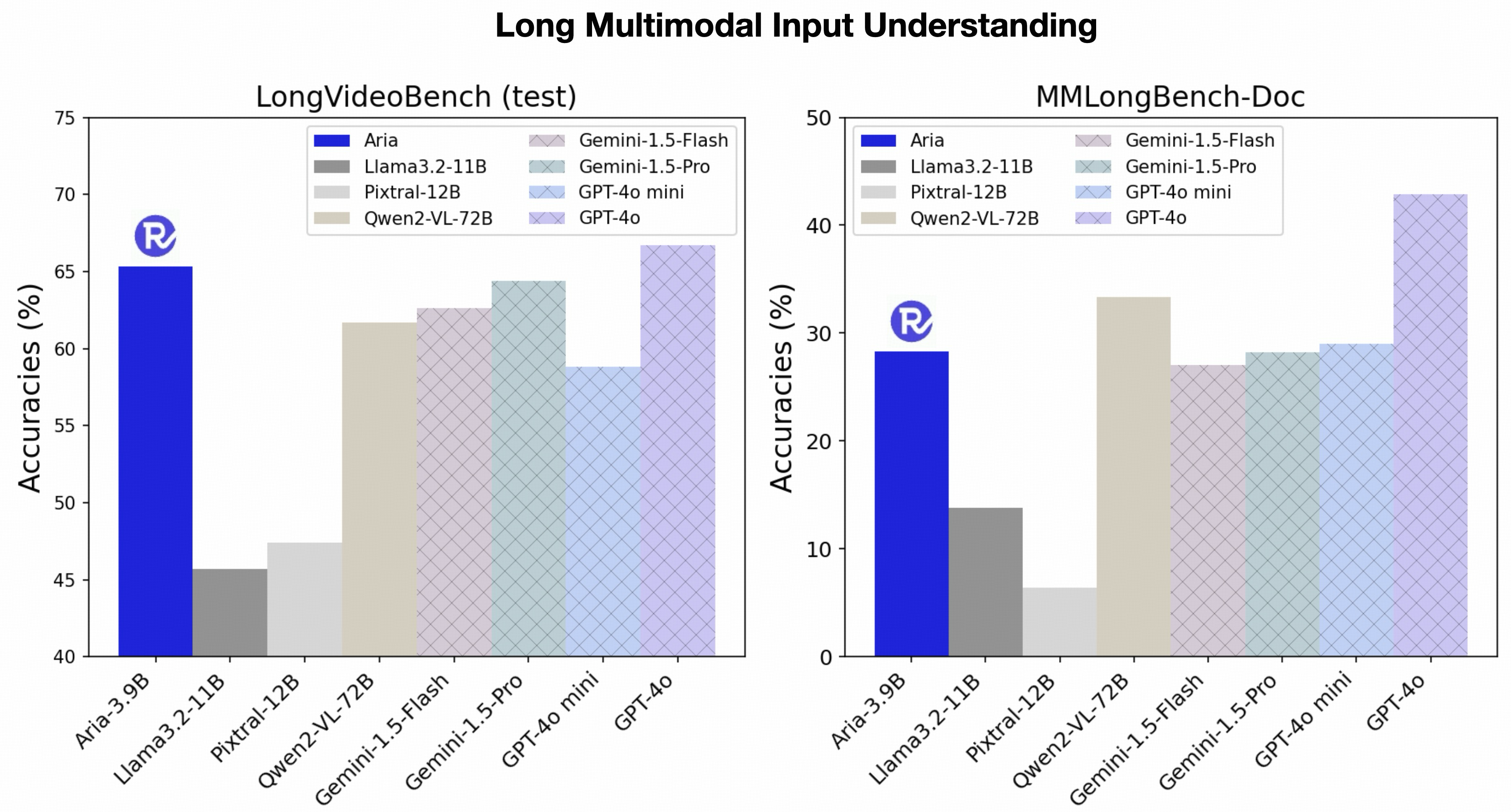在长视频理解上 Aria 甚至超越了 GPT-4o mini 在长文档理解上则优于 Gemini-1.5-Flash 这使得它在处理海量多模态数据时更加高效且准确。