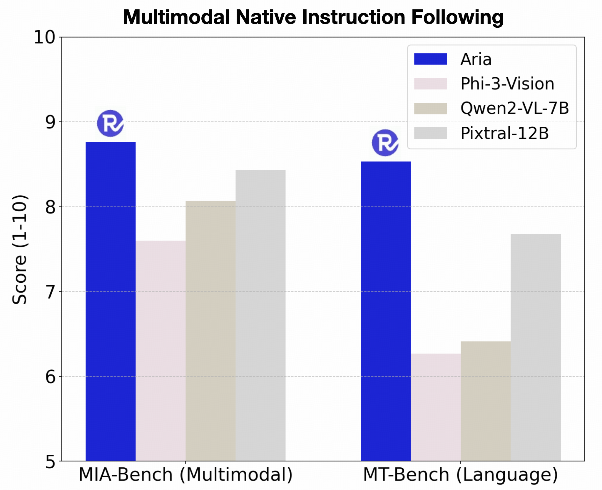 模型理解并执行用户指令的能力至关重要。Aria 在多模态和语言输入下的指令遵循能力表现突出 在 MIA-Bench 和 MT-Bench 等主流评测基准上 均优于现有的顶级开源模型。
