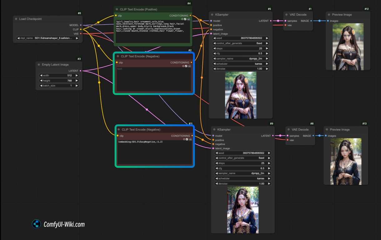 Embedding 模型的使用非常简单,只需要在 CLIP Text Encode 节点中调用即可: