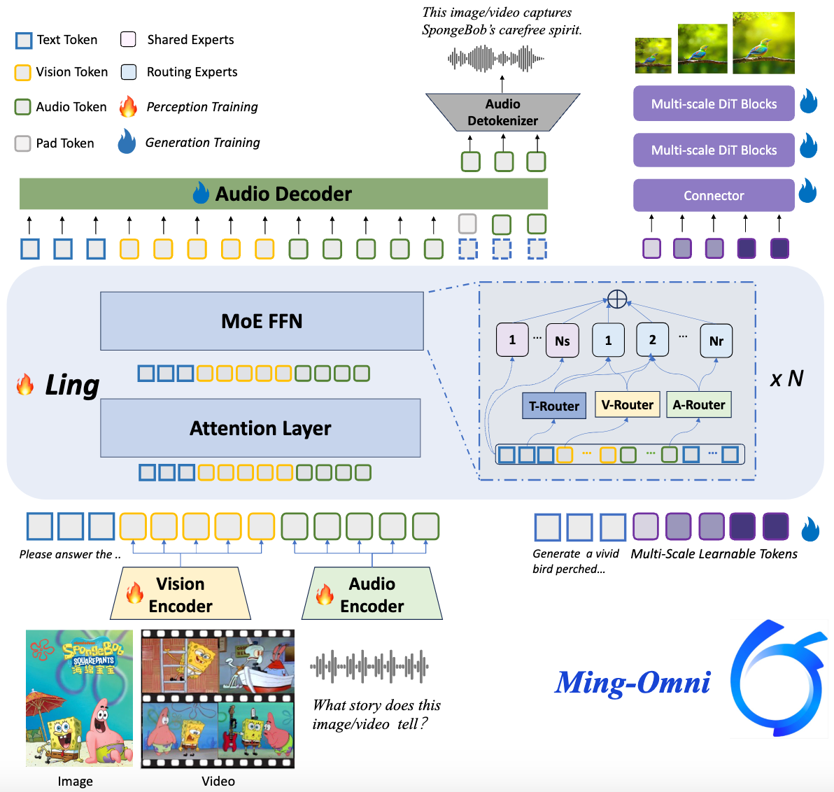 我们常常认为,要实现图像、文本、音频、视频的全能感知,并进一步触及多模态生成,模型参数量必然是海量的。然而,Ming Lite 万能模型通过其巧妙的混合专家(MoE)架构,并为不同模态设计了专门的路由机制,在仅有 2.8 亿激活参数的情况下,展现了令人惊叹的效率与广度。