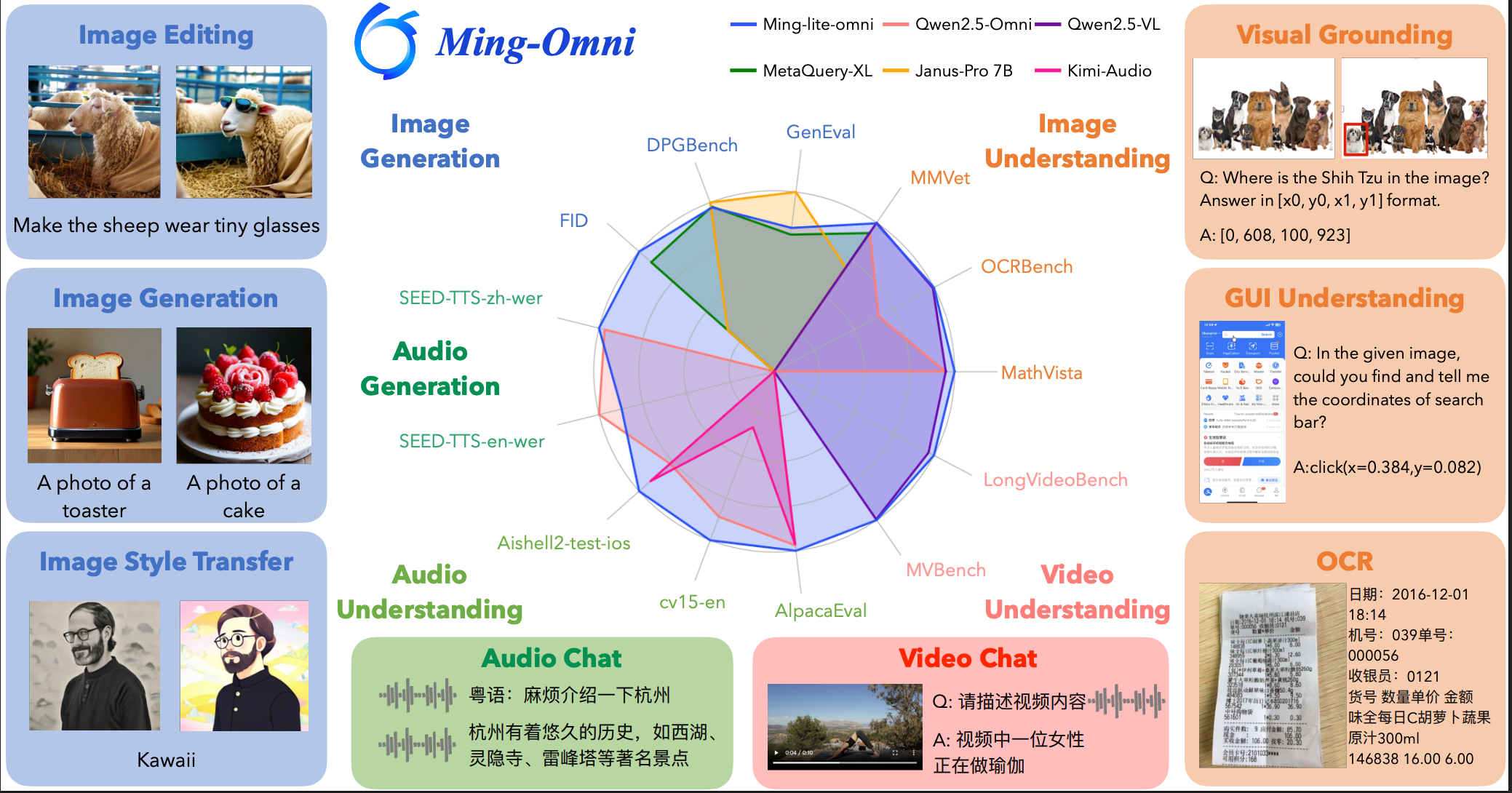 Ming Lite 万能模型并非仅仅停留在理解层面,它将生成能力提升到与感知同等重要的地位。通过集成先进的音频解码器和 Ming Lite 统一模型(Ming-Lite-Uni),它能够进行自然流畅的语音生成和高质量图像生成。这意味着除了常规的多模态问答、视频理解、多轮对话外,它还能胜任文本转语音、上下文感知的聊天,甚至进行多样化的图像编辑。这种从输入理解到输出创造的无缝切换,在用户体验和应用潜力上都带来了巨大飞跃。