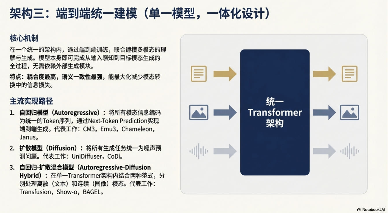 OFA。 - 主流范式:当前主流是基于大型语言模型(LLM)的架构,主要分为两大流派:
