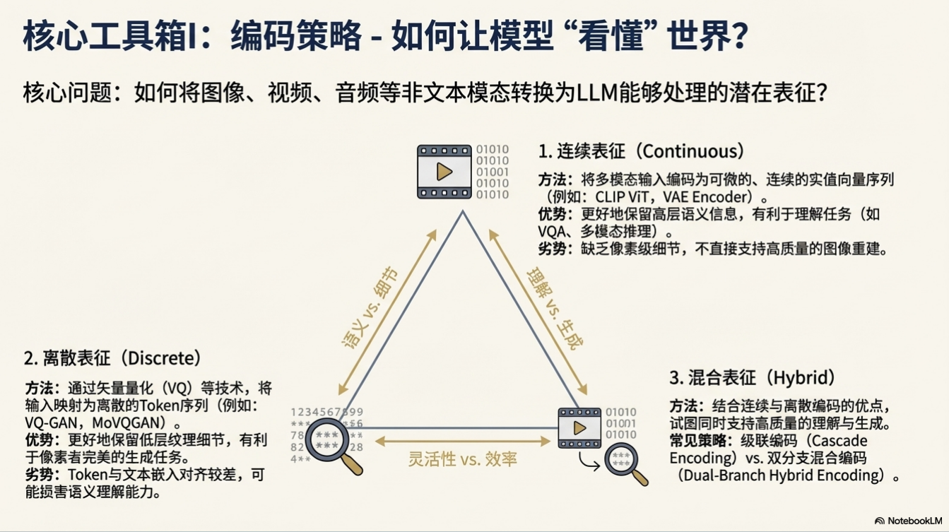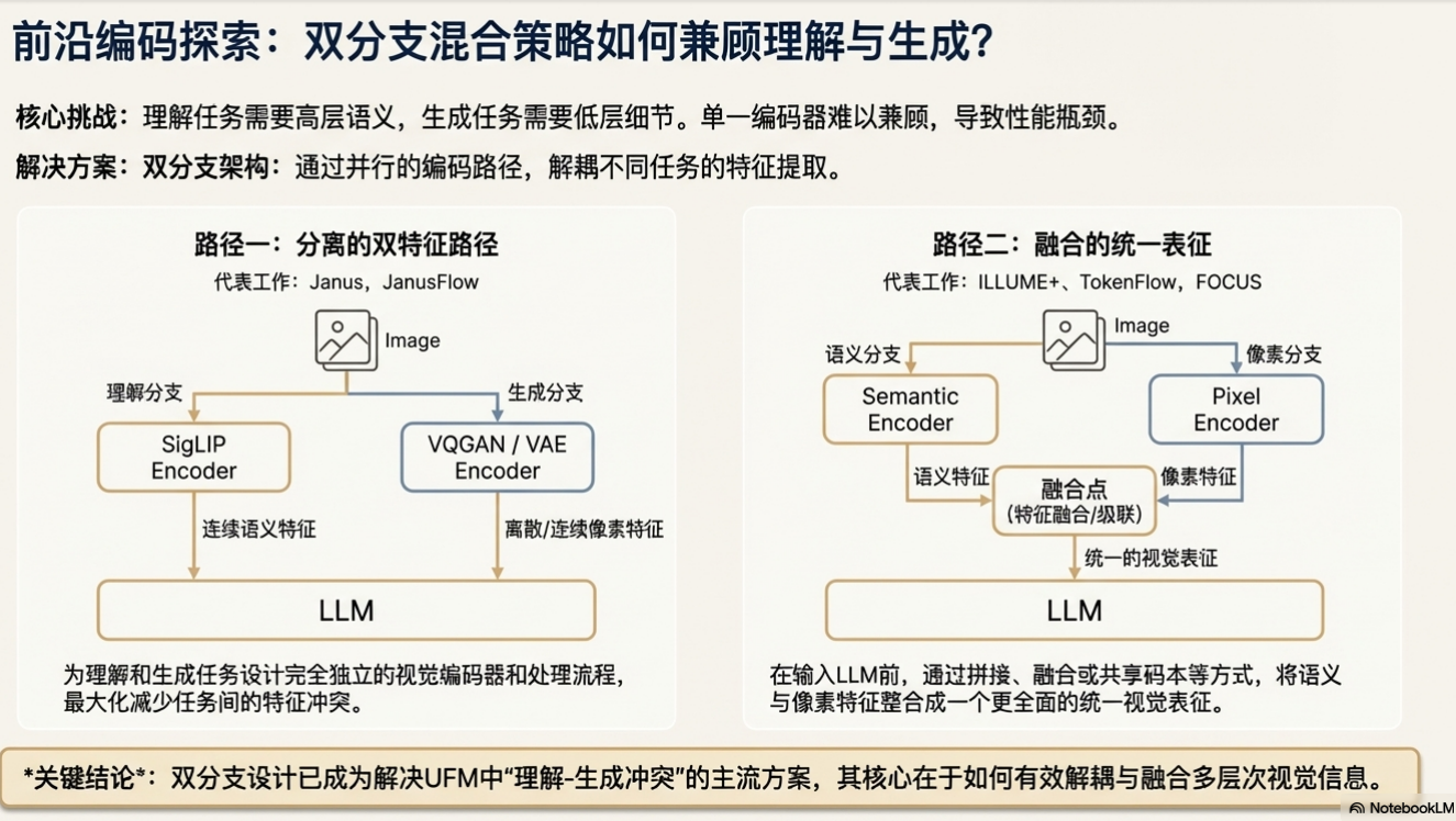 为了结合连续与离散表示的优点,混合编码策略应运而生。这类策略通常采用“级联”或“双分支”架构,同时提取用于理解任务的语义特征(连续)和用于生成任务的细节特征(离散),以期在单一模型中实现两种能力的最佳平衡。