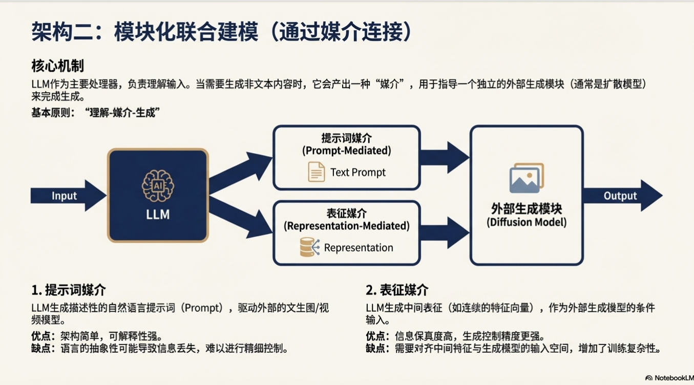 模块化联合建模是一种介于完全集成和完全统一之间的折衷方案。它通常由一个核心的语言模型和一个或多个独立的生成模块组成,二者通过特定的“媒介”连接,协同工作。根据媒介的不同,该范式可进一步分为两种技术路线。