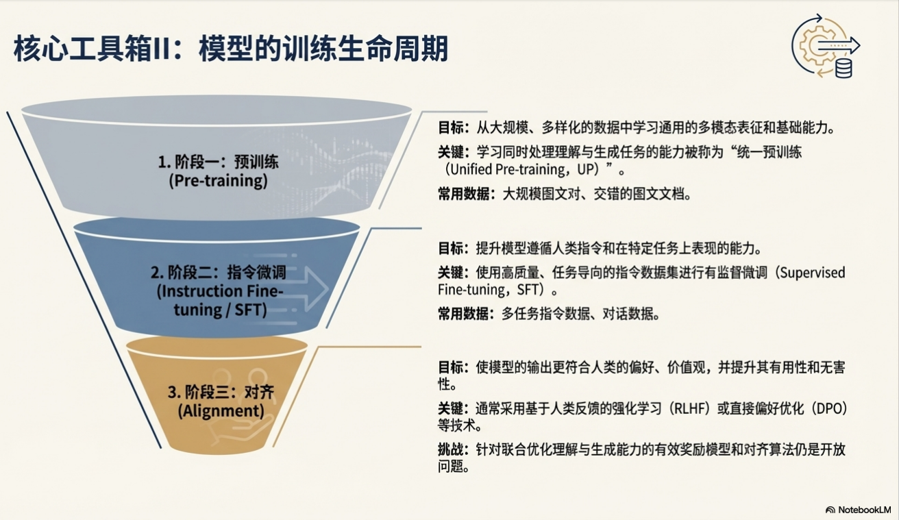 训练与微调是赋予统一多模态基础模型(UFM)强大能力的关键过程,它将模型架构与海量数据相结合,塑造其理解与生成的核心功能。本章将首先解构 UFM 预训练阶段的模块化构建范式,然后系统阐述用于优化模型性能的两种核心路径:监督微调(SFT)和对齐微调(AFT)。