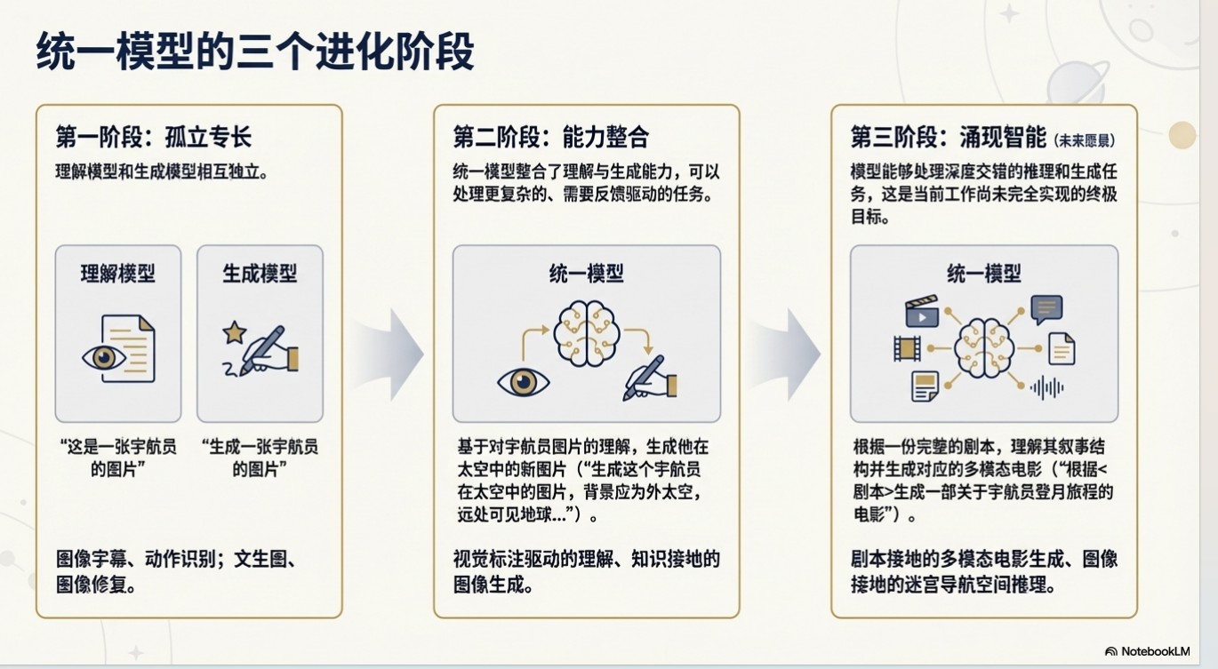 统一多模态模型的发展并非一蹴而就,而是经历了一个从孤立到组合,并最终迈向能力涌现的演进过程。其历程可被理解为以下三个独特阶段: