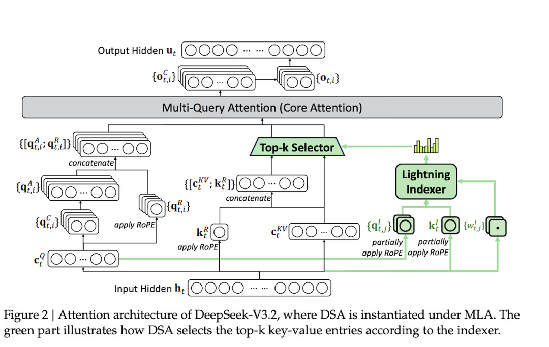 从架构上看,DeepSeek-V3.2 几乎与 V3.1-Terminus 是同一型号。主要创新是基于多头潜在注意力(MLA)的深度寻稀疏注意力(DSA)技术,这是一种密集注意力变体,将 KV 向量投射到低维空间以减少内存占用。