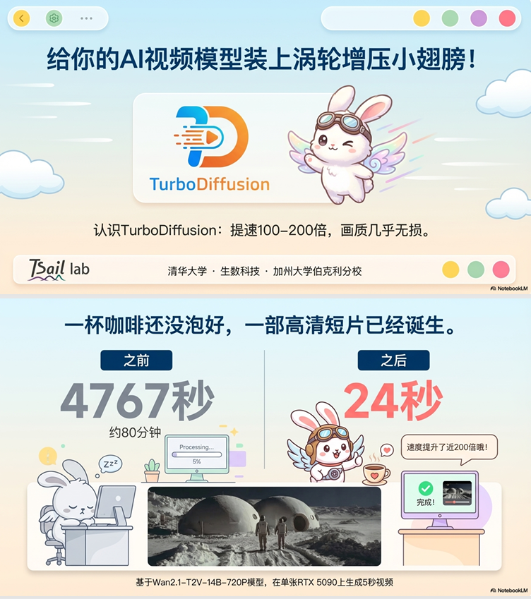 如果生成一段高清视频的时间,从一个多小时缩短到几十秒,会带来怎样的改变?这意味着创作者可以即时验证想法,快速迭代作品,让创意真正地“流动”起来。现在,一个名为 TurboDiffusion 的全新加速框架,正让这一切成为现实。它如同一台性能强悍的引擎,正在为 AI 视频生成领域带来革命性的速度提升。