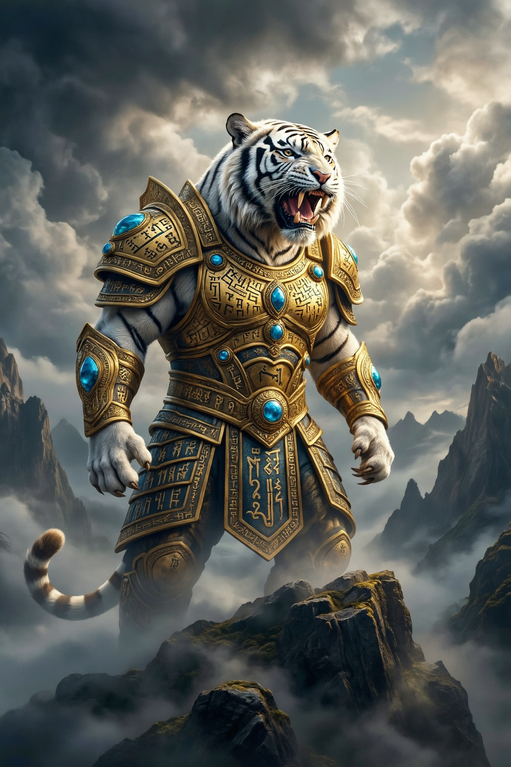 Fantasy digital art of a majestic white tiger wearing ornate golden battle armor. The armor is engraved with intricate ancient runes and set with blue gemstones. The tiger stands proudly on a rocky cliff edge, roaring. Background of epic swirling storm clouds and distant mountain peaks. Regal, powerful pose. Fur texture is hyper-realistic. Cinematic lighting, epic fantasy style, 8k resolution, highly detailed.创意解析: