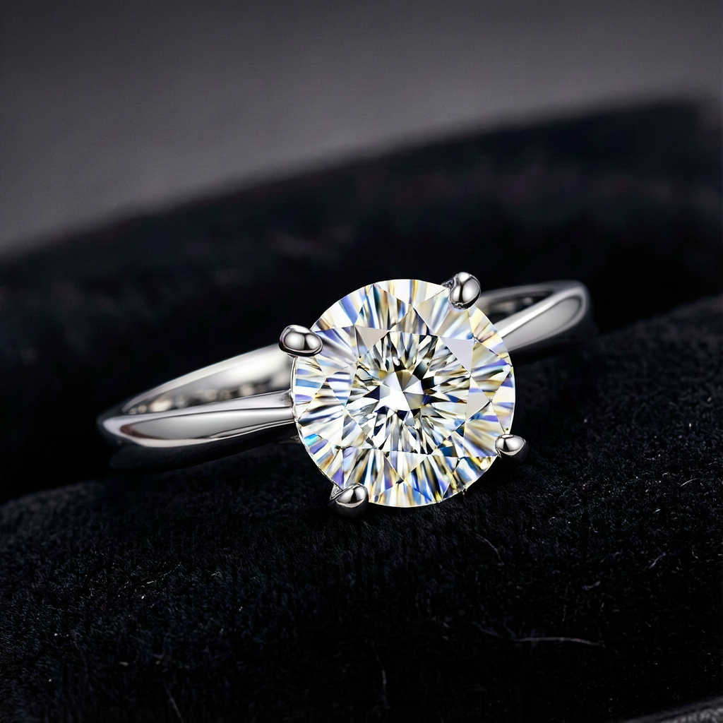 Macro luxury jewelry photography of a platinum diamond engagement ring resting on rich black velvet fabric. The large solitaire diamond captures the light, creating brilliant prismatic refractions and sparkles (fire and brilliance). Sharp focus on the facets of the gem. The metal band is polished and reflective. Elegant, expensive, high-end commercial look. Studio lighting, shallow depth of field.创意解析: