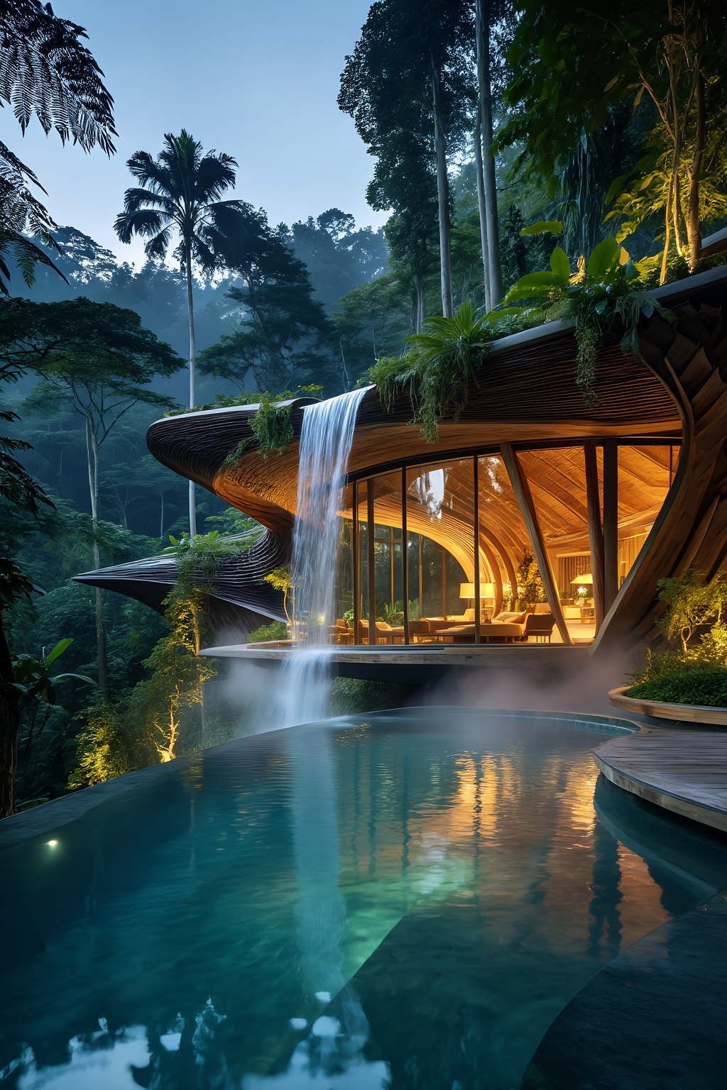 Architectural photography of a futuristic eco-friendly villa nestled in a lush tropical rainforest. The structure is organic, made of curved glass and sustainable teak wood, integrating seamlessly with nature. A waterfall cascades from the roof into a crystal clear infinity pool below. Warm golden interior lighting glows through the glass walls, contrasting with the cool blue twilight of the forest. Mist hovering over the water. Ultra-realistic, 8k resolution, architectural digest style.创意解析: