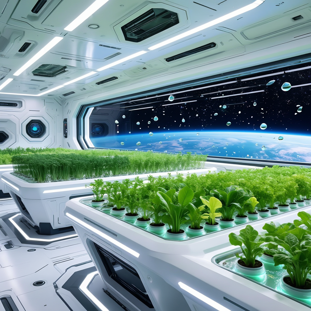 Interior view of a futuristic spaceship greenhouse. Rows of lush green plants and vegetables growing in hydroponic pods. Sleek white sci-fi architecture with LED strip lighting. A large observation window shows a stunning view of planet Earth and stars in the black void of space. Zero gravity floating water droplets. Clean, sterile yet vibrant atmosphere. 8k resolution, photorealistic sci-fi concept art.创意解析: