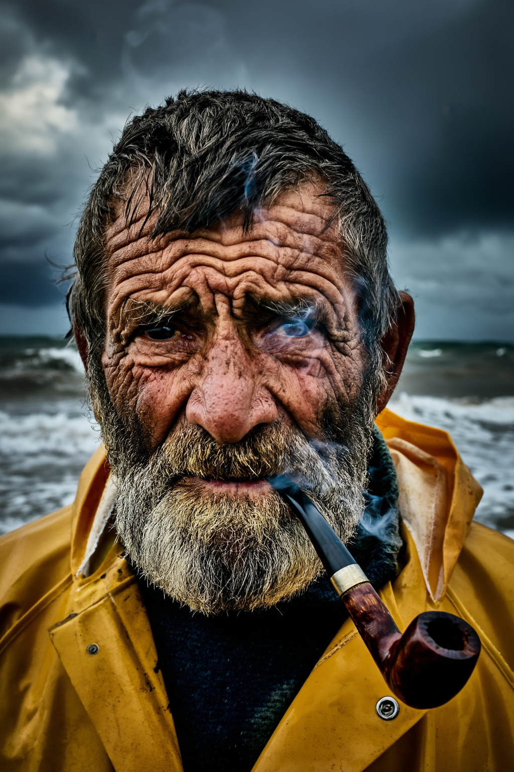 Cinematic portrait of an elderly fisherman with a weathered, sun-beaten face. Deep wrinkles telling a story of a life at sea. He has a thick gray beard and is smoking a wooden pipe, creating wisps of smoke. Wearing a yellow rain slicker. Background is a dramatic stormy sea with crashing waves and dark clouds. Moody, dramatic lighting, high contrast, Steve McCurry style photography, 85mm lens, sharp focus on eyes.创意解析: