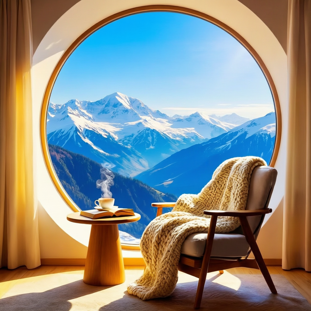 Interior design photography of a cozy reading nook by a large circular window. Outside the window is a breathtaking view of snow-capped mountain ranges under a clear blue sky. Inside, a comfortable armchair with a chunky knit blanket, a steaming cup of tea on a wooden side table, and an open book. Warm, hygge atmosphere. Soft morning sunlight streaming in, casting gentle shadows. High resolution, architectural visualization style.创意解析: