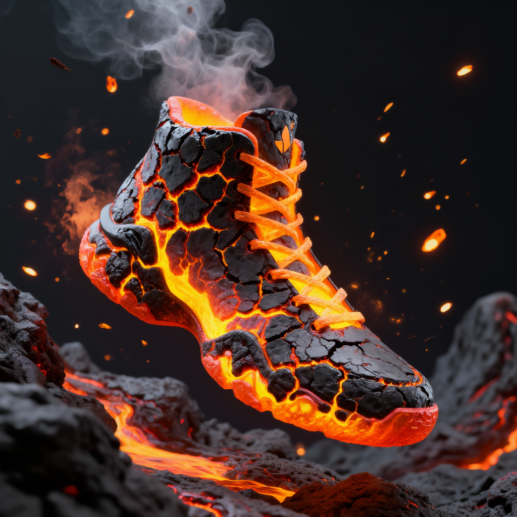 Concept art of a high-top sneaker made of cracking black obsidian stone with glowing molten magma flowing inside the cracks. Smoke and embers rising from the shoe. Dynamic floating pose against a dark volcanic background. The sole is made of cooled lava rock. Hypebeast street style meets fantasy element. High contrast, vibrant orange and black colors. 3D render, Octane render quality, ultra-detailed textures.创意解析: