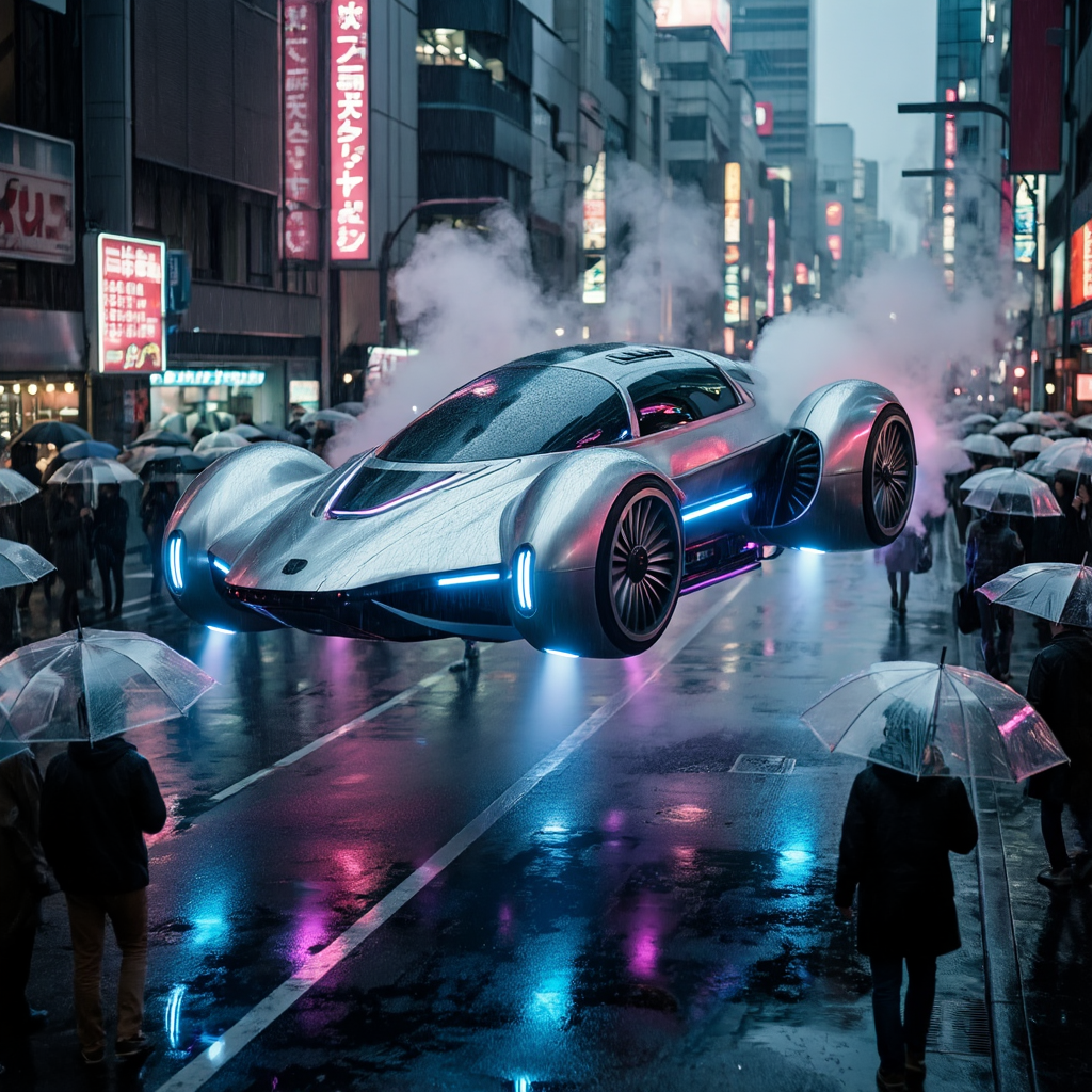 Concept art of a retro-futuristic flying car hovering just above a rain-soaked street in Neo-Tokyo. The car has a sleek silver body with glowing neon strips and turbine wheels. Reflections of colorful neon signs (kanji characters) on the wet pavement and the car's metallic surface. Cyberpunk atmosphere, steam rising from vents, crowds of people with transparent umbrellas in the background. Cinematic shot, Blade Runner vibe, photorealistic rendering.创意解析: