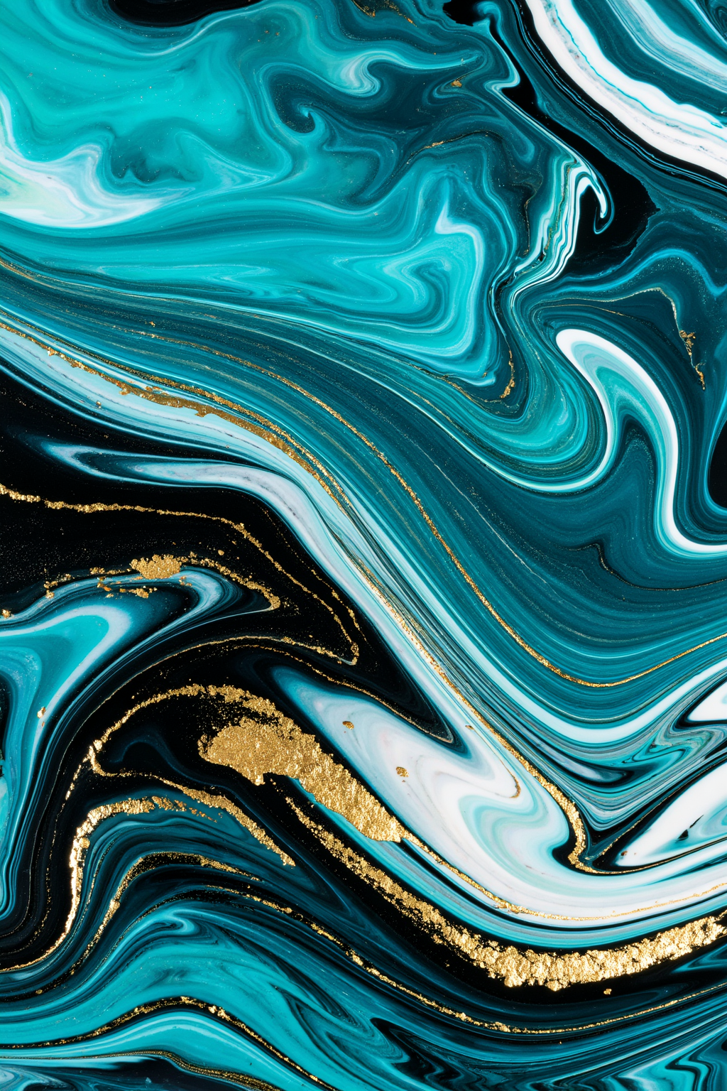 Abstract fluid art wallpaper. Swirling liquid colors of deep turquoise, obsidian black, and pearl white. Veins of metallic gold leaf running through the mixture. Marble stone texture, liquid motion effect. High contrast, glossy finish. Elegant, luxurious, modern art style. 8k resolution, sharp details, no blur.创意解析: