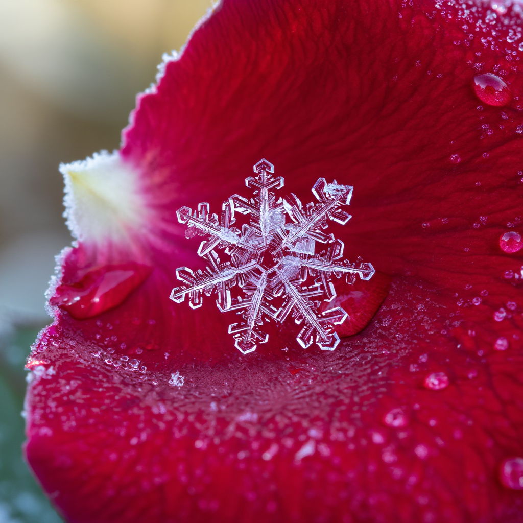 Extreme macro photography of a single intricate snowflake landing on a velvety deep red rose petal. The snowflake's crystalline hexagonal structure is perfectly sharp and distinct against the soft organic texture of the petal. Morning frost and tiny water droplets surrounding it. Soft natural winter morning light, creamy bokeh background. National Geographic quality, scientific detail, stunning contrast between red and white.创意解析:
