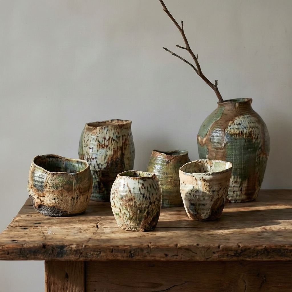 Still life photography of a set of handmade ceramic pottery arranged on a rustic weathered wooden table. The pottery has imperfect organic shapes and textured speckled glaze in earth tones (beige, brown, sage green). A dried branch in a vase. Natural sunlight casting hard shadows, highlighting the texture of the clay and wood. Wabi-sabi aesthetic, simple, modest, austere beauty. High resolution, sharp texture detail.创意解析: