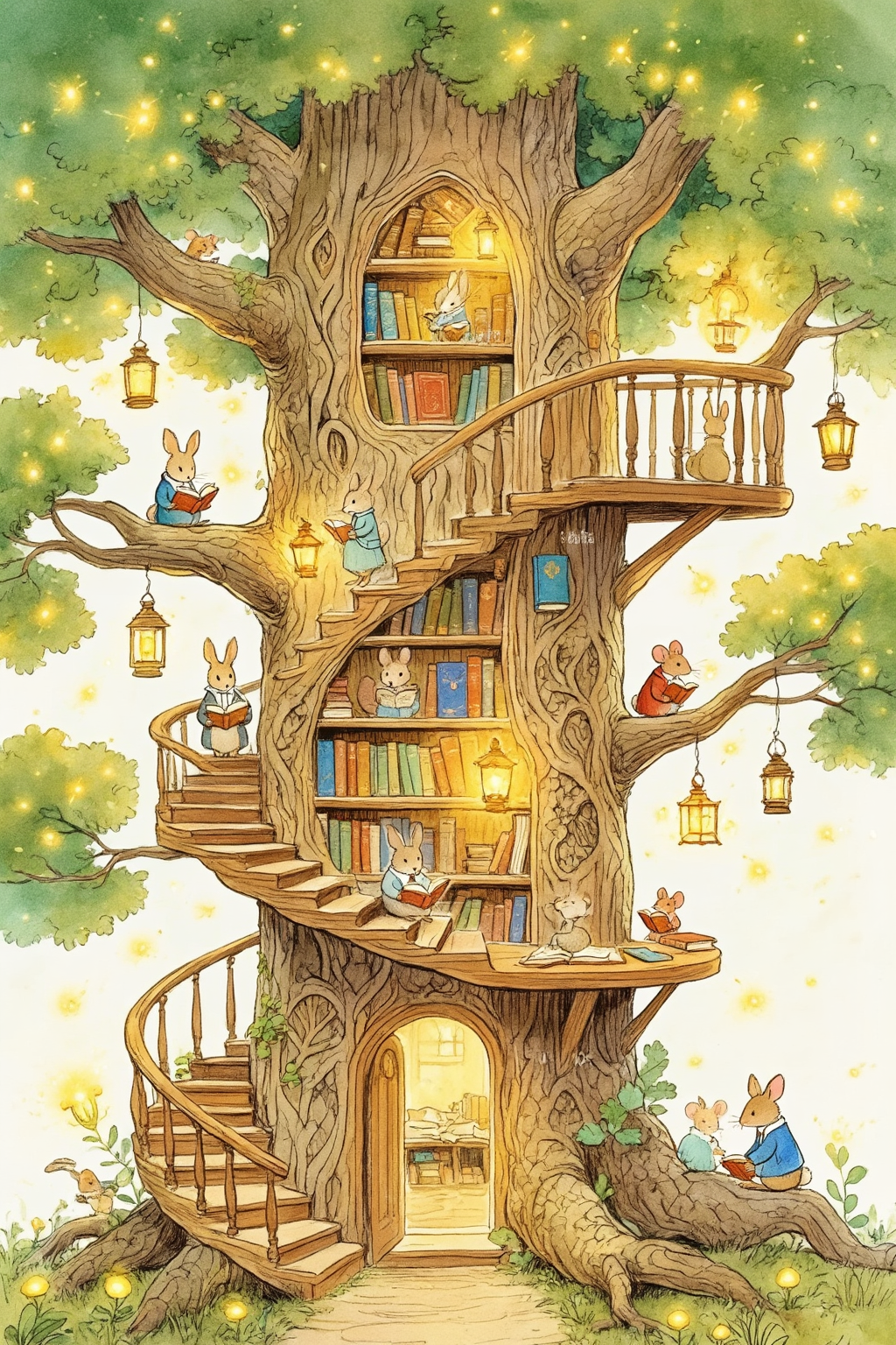 Whimsical storybook illustration of a cozy library built inside a giant hollow oak tree. Spiral wooden staircases, shelves carved into the bark filled with ancient books. Tiny anthropomorphic animals (rabbits, mice, squirrels) reading books by the light of hanging lanterns and fireflies. Warm, golden, magical atmosphere. Detailed line work with watercolor coloring style. Beatrix Potter aesthetic, charming and peaceful.创意解析: