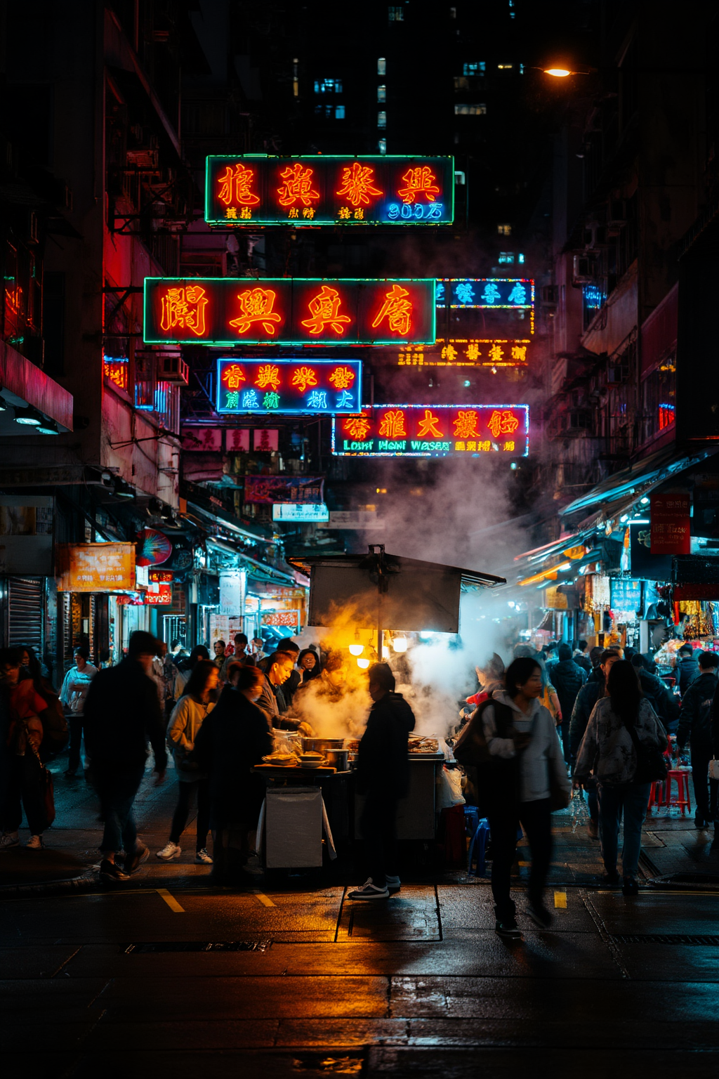 Cinematic street photography of a bustling night market in Hong Kong. Dense layers of glowing neon signs in red, blue, and green Chinese characters extending into the distance. Steam rising from street food stalls, crowds of people moving through the narrow alley. Wet pavement reflecting the neon lights. Wong Kar-wai cinematic style, moody color grading, slight motion blur on people to show movement, sharp focus on the foreground stall. Atmospheric, vibrant, urban.创意解析: