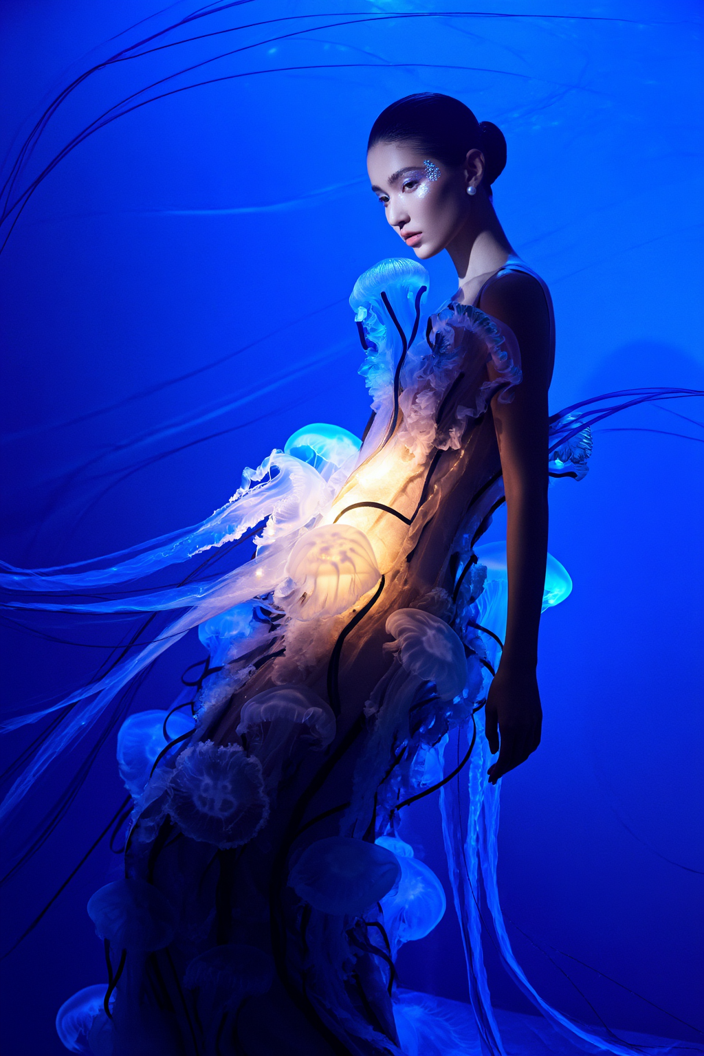 High fashion editorial photography. A model wearing an avant-garde dress made of translucent, bioluminescent jellyfish material that glows softly in the dark. The dress has flowing, tendril-like ribbons floating as if underwater. Deep oceanic blue background with faint light rays from above. Ethereal, mysterious, and elegant atmosphere. Flawless makeup with pearlescent highlights. Vogue magazine quality, cinematic lighting, sharp focus.创意解析: