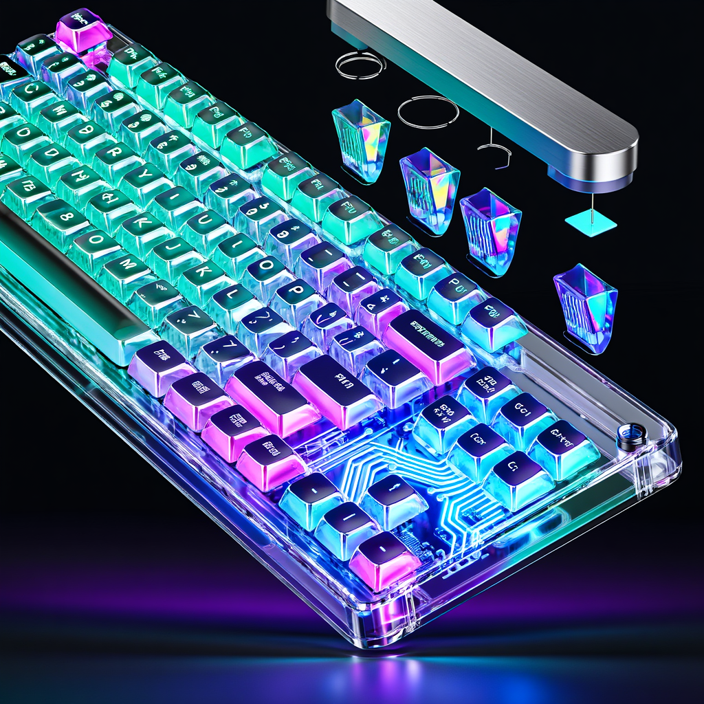 Product photography of a futuristic transparent mechanical keyboard, cyberpunk aesthetic. The casing is clear acrylic revealing complex internal circuitry and neon RGB lighting in cyan and magenta. Keycaps are crystal clear with holographic legends. The keyboard is shown in a floating exploded view to highlight components. Sleek brushed metal frame. Dark background with neon reflections. High-tech, premium gadget feel, macro details, depth of field.创意解析: