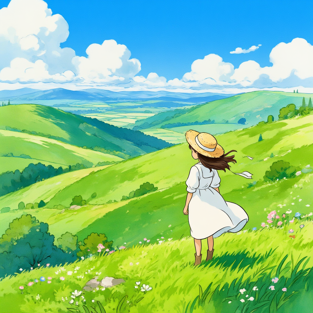 Ghibli style illustration, a young girl standing on a grassy hilltop overlooking a vast countryside with rolling green hills, scattered wildflowers, and a clear blue sky with fluffy white clouds. She wears a white dress and a straw hat, hair blowing gently in the wind. Studio Ghibli aesthetic, warm and nostalgic color palette, soft lighting, hand-painted texture, peaceful and dreamlike atmosphere, high quality, masterpiece.Negative Prompt