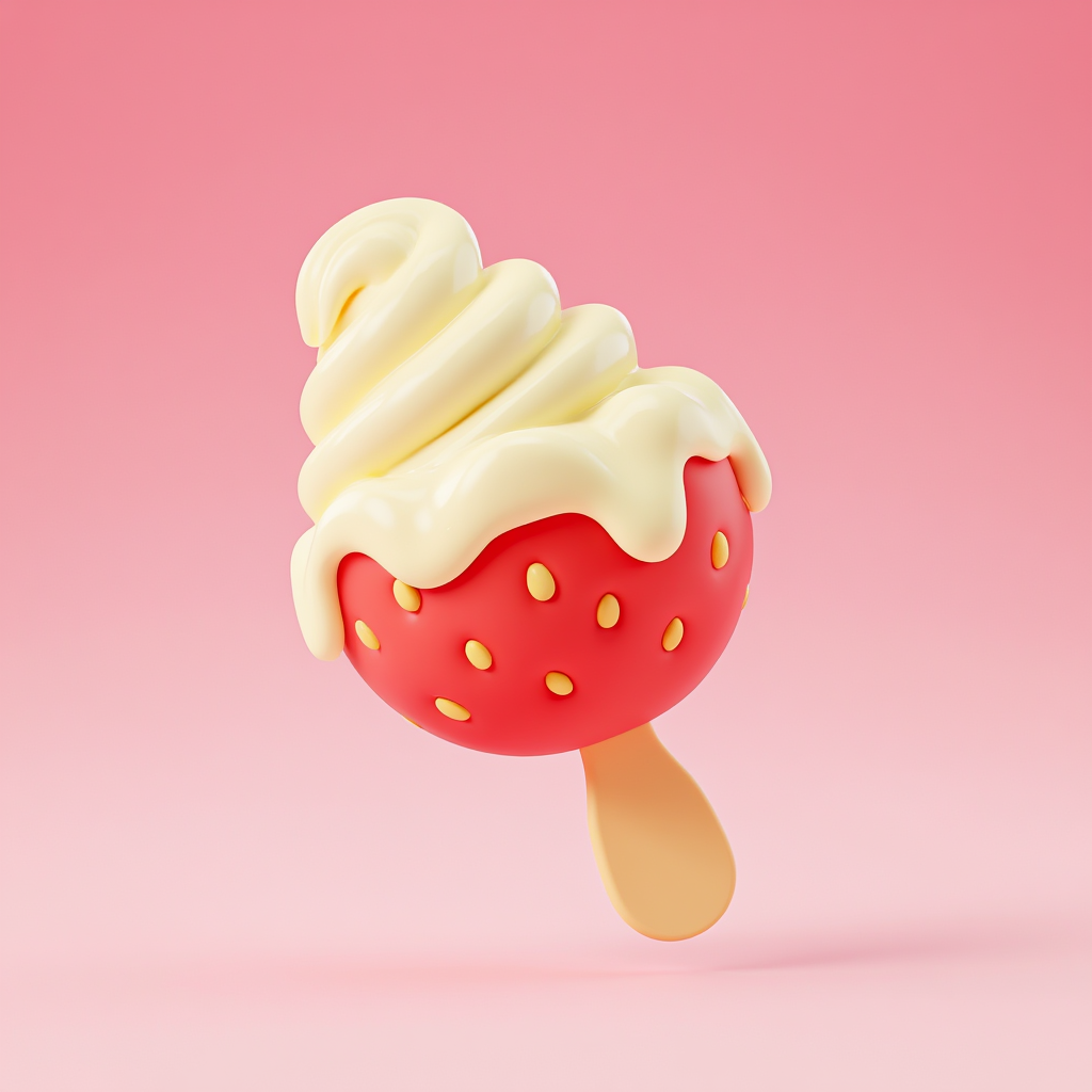 Transform the strawberry emoji into a creamy ice cream bar, with cream flowing in curved swirls on top, making it look delicious and tempting. The ice cream is floating at a 45-degree angle in mid-air, rendered in a cute chibi-style 3D aesthetic. Solid pink gradient background with unified pastel color palette. The strawberry shape is clearly recognizable, with seeds visible through the cream. Soft studio lighting, glossy texture, appetizing food photography style.Negative Prompt