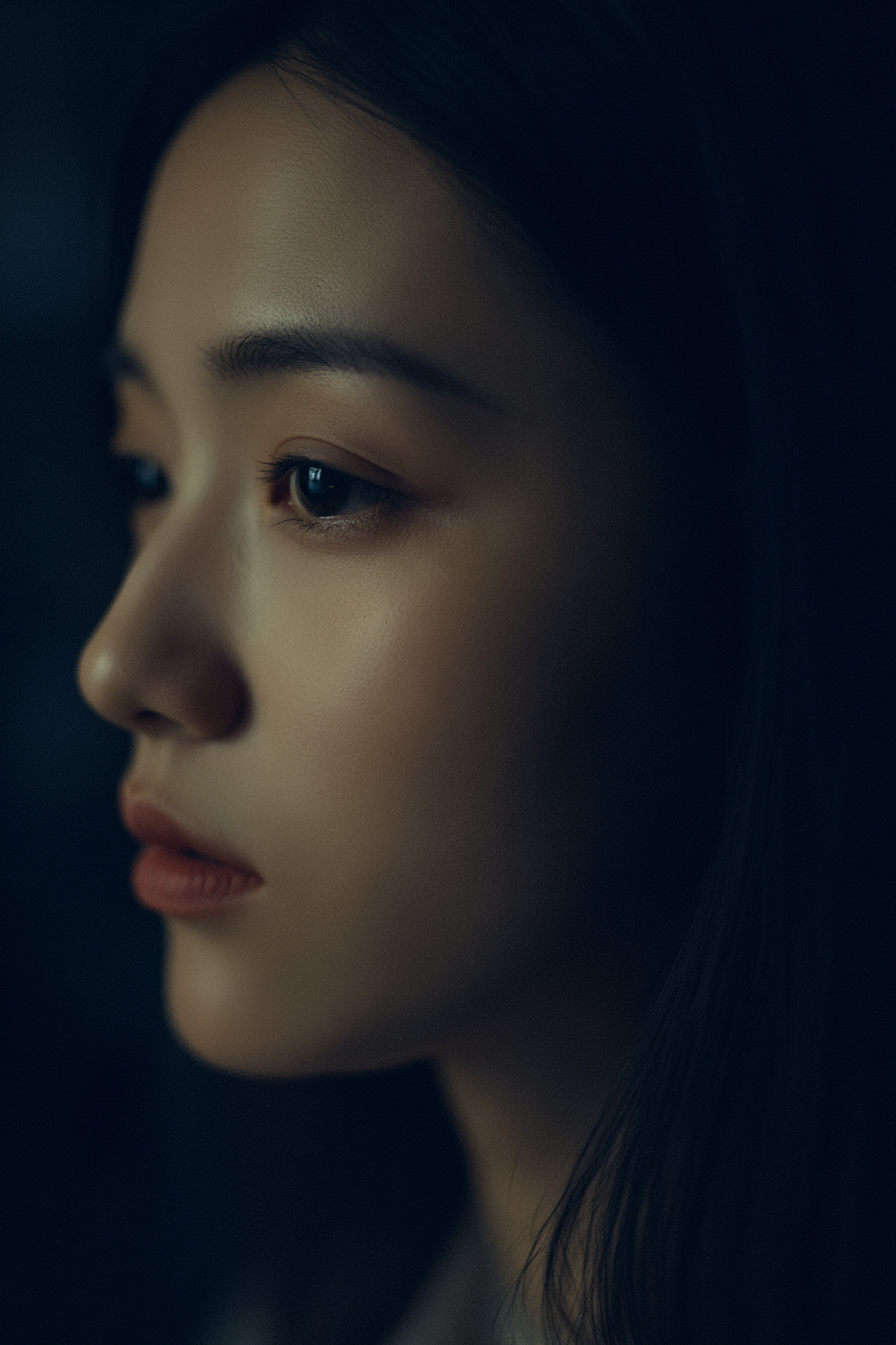 Cinematic digital art, hyper-realistic photography. Close-up profile portrait of a young Asian woman, soft Rembrandt lighting from the side illuminating her cheekbone and nose bridge. Completely blurred dark background. Slightly melancholic gaze, lips slightly parted. Skin texture is fine with visible pores and texture, cinematic film grain, low saturation, high contrast. Navy blue and warm brown as main color tones. Vertical composition, face centered, extremely shallow depth of field with only the eye to nose tip in sharp focus.Negative Prompt
