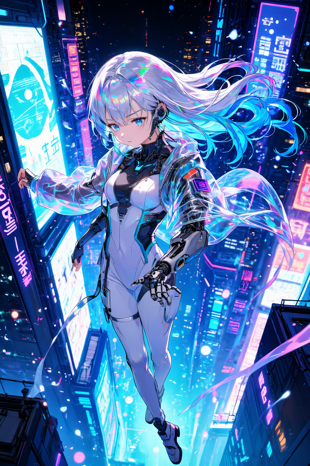 Masterpiece anime illustration, a stunning cyberpunk girl floating above a neon-lit futuristic city at night. She has iridescent silver long hair with tips fading to electric blue, wearing a semi-transparent tech jacket over a sleek bodysuit. Intricate mechanical prosthetic arm details. Background features massive holographic billboards with Chinese characters. High saturation colors, dramatic light and shadow contrast, particle effects swirling around, Tyndall effect, depth of field bokeh, 8k resolution, ultra-fine details.Negative Prompt