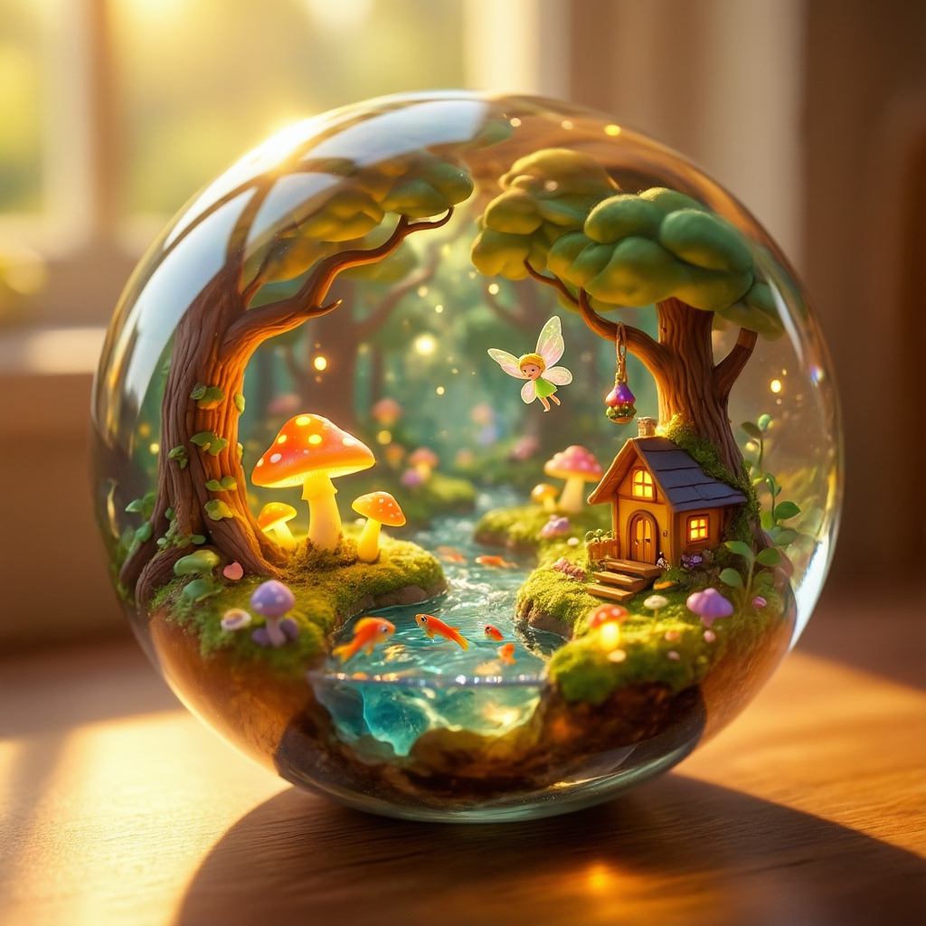A delicate crystal ball resting quietly on a warm, softly lit wooden tabletop by the window. Warm-toned sunlight gently passes through the crystal ball, refracting specks of golden light. Inside the crystal ball, a miniature three-dimensional enchanted forest world is displayed - tiny glowing mushrooms, a small fairy with translucent wings, a babbling brook with tiny fish, and a miniature treehouse. All elements are rendered in adorable chibi style, exquisitely crafted. The overall atmosphere is magical and dreamlike, with intricate details and a warm comforting glow.Negative Prompt