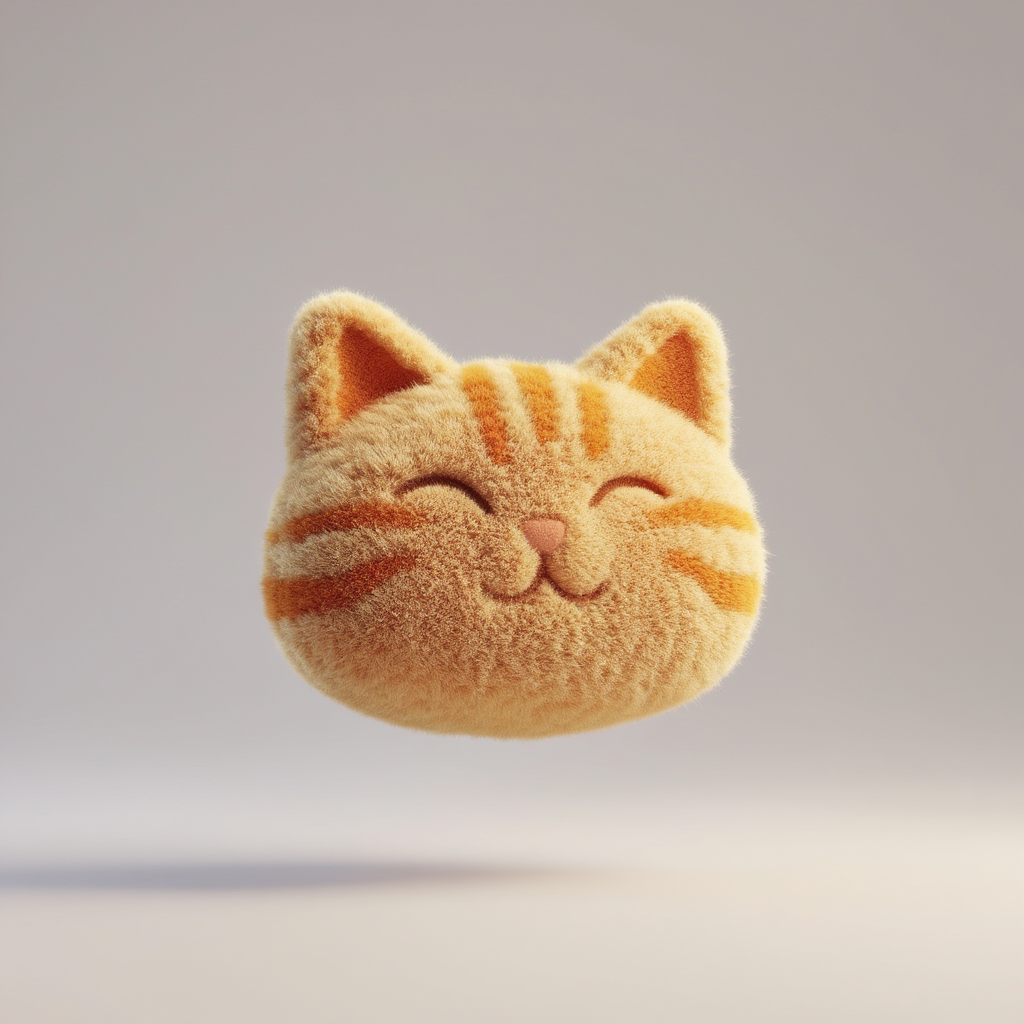 Transform a simple cat face icon into a soft, 3D fluffy object. The cat shape is fully covered in hyperrealistic fur with orange tabby pattern, soft shadows and ambient occlusion. Cute closed-eye smile expression. The fluffy cat pillow is centered on a clean light gray background and floats gently in space. The style is surreal, tactile, and modern, evoking a sense of comfort and playfulness. Studio lighting emphasizing fur texture, high-resolution render, centered composition with generous negative space.Negative Prompt