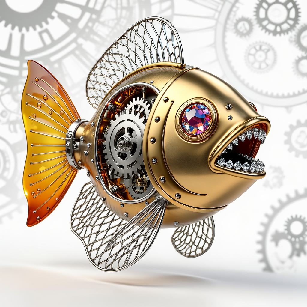 A steampunk-style mechanical fish with a brass body and clearly visible gear mechanisms. Mechanical teeth neatly arranged, made of diamond material. The tail fin has a metal wire mesh structure, other fins are semi-transparent amber-colored glass with subtle bubbles inside. The eyes are multi-faceted rubies with reflective shine. The image shows the entire fish centered in the frame, head pointing right, with adequate white space. Background has subtle steampunk-style gear patterns. High-definition with extremely rich details and unique metallic texture aesthetics.Negative Prompt