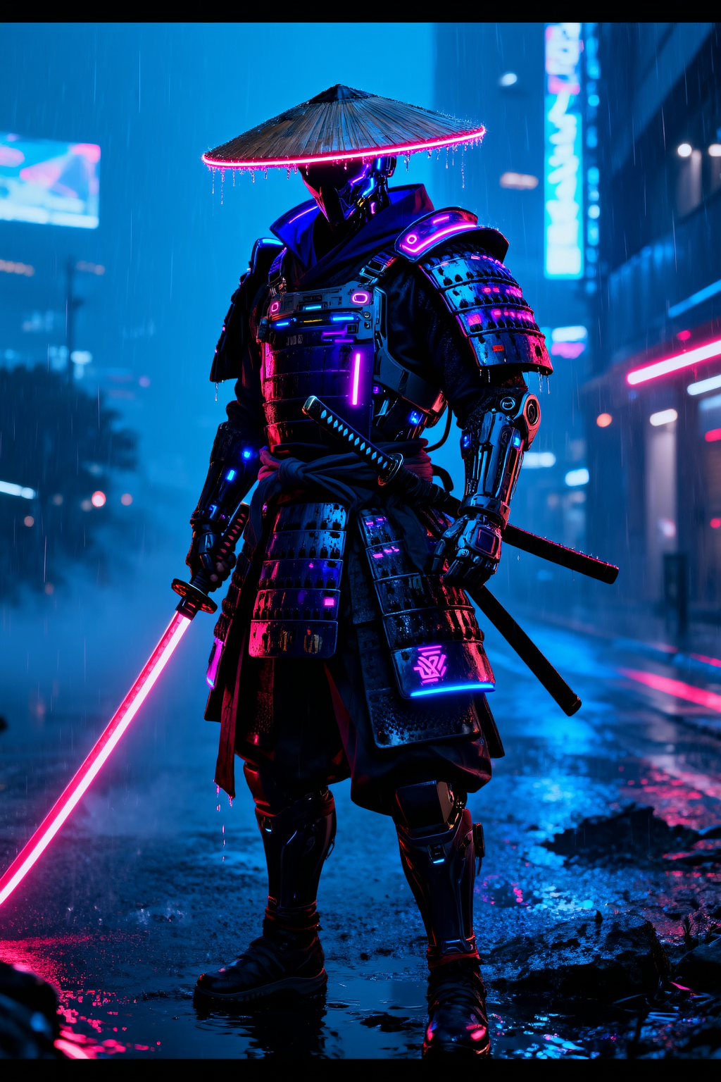 Character design of a Cyberpunk Samurai standing in a rainy neon city street. Traditional samurai armor mixed with high-tech mechanical parts and glowing LED strips. Wearing a traditional straw hat (kasa) with neon rim. Holding a katana with a laser energy blade. Face hidden in shadow or by a cybernetic mask. Rain dripping off armor. Cool blue and magenta lighting. Badass, warrior, futuristic. Unreal Engine 5 render, 8k.叙事解析: