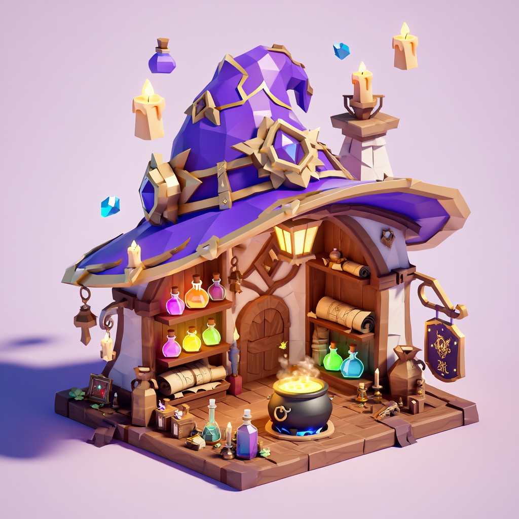 3D isometric render of a cozy magic potion shop. The building is shaped like a giant wizard hat. Inside, shelves filled with glowing colorful potion bottles, ancient scrolls, and magical artifacts. A cauldron bubbling in the center. Outside, floating candles and a mystical sign. Purple and gold color scheme. Cute, stylized, low poly aesthetic but with high quality textures and lighting. Blender 3D style, soft shadows.叙事解析: