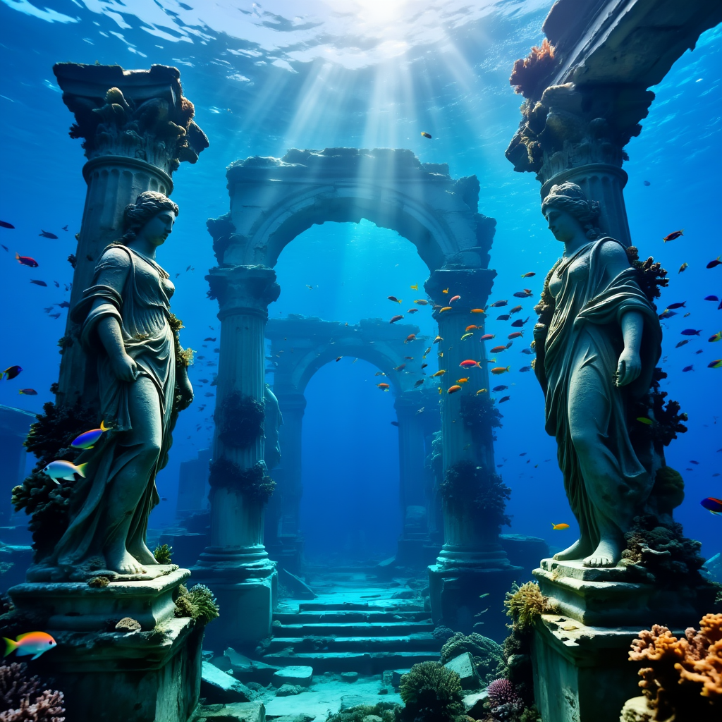 Underwater photography of ancient ruins of a lost civilization. Greek-style columns and statues overgrown with coral and seaweed. Schools of colorful tropical fish swimming through arches. God rays of sunlight piercing through the deep blue water from the surface. Mystery, exploration, serenity. National Geographic style, 8k resolution, photorealistic water distortion and caustic effects.叙事解析: