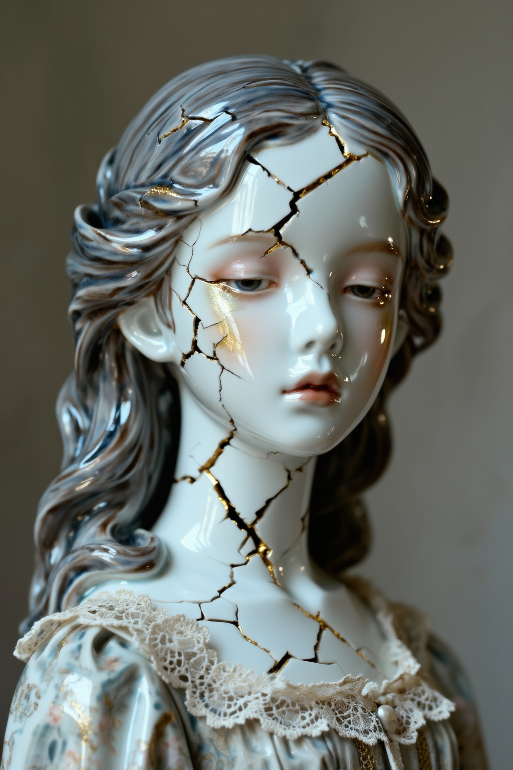Surreal portrait of a girl who looks like a cracked porcelain doll. Her skin is white and glossy like ceramic, with fine cracks on her cheek revealing gold kintsugi filling. She wears a vintage lace dress. Expression is blank and doll-like. Soft, eerie lighting. Fine art photography style, haunting, beautiful, fragile. High contrast, sharp details.叙事解析: