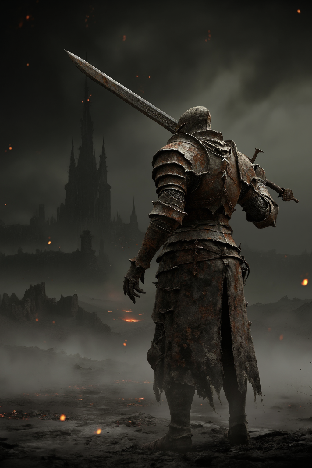 Dark fantasy concept art in the style of Dark Souls or Elden Ring. A weathered knight in rusted plate armor standing in a desolate, ash-covered wasteland. Glowing embers floating in the air. The knight holds a massive greatsword resting on shoulder. Ominous dark castle in the distance. Low key lighting, volumetric fog, gritty texture, desaturated colors with hints of orange fire. Epic, intimidating, lonely atmosphere.叙事解析: