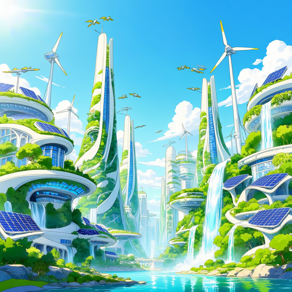 Solarpunk cityscape concept art. A futuristic city where technology and nature coexist in harmony. Skyscrapes covered in vertical gardens and waterfalls. Flying wind turbines, solar panels integrated into organic architecture. Bright sunny day, clear blue sky, optimistic atmosphere. Art Nouveau influence, curved lines, white and green color palette. Studio Ghibli meets high-tech. 8k resolution, highly detailed.叙事解析: