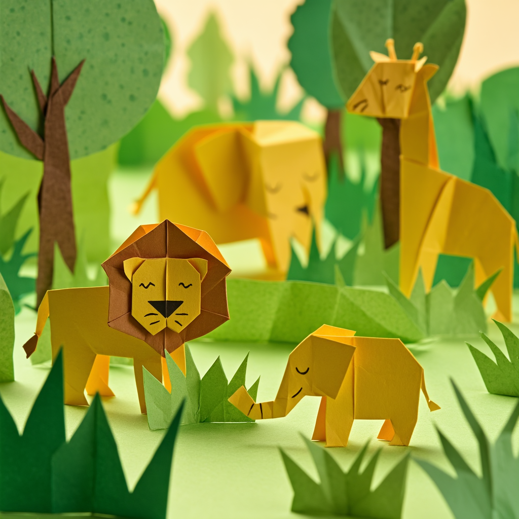 A miniature scene of a zoo made entirely of origami paper animals. Paper lions, elephants, and giraffes in a paper jungle. Trees and grass also made of folded green paper. Shallow depth of field macro photography. Soft studio lighting. Clean, precise folds, paper texture visible. Cute, creative, handcrafted look.叙事解析: