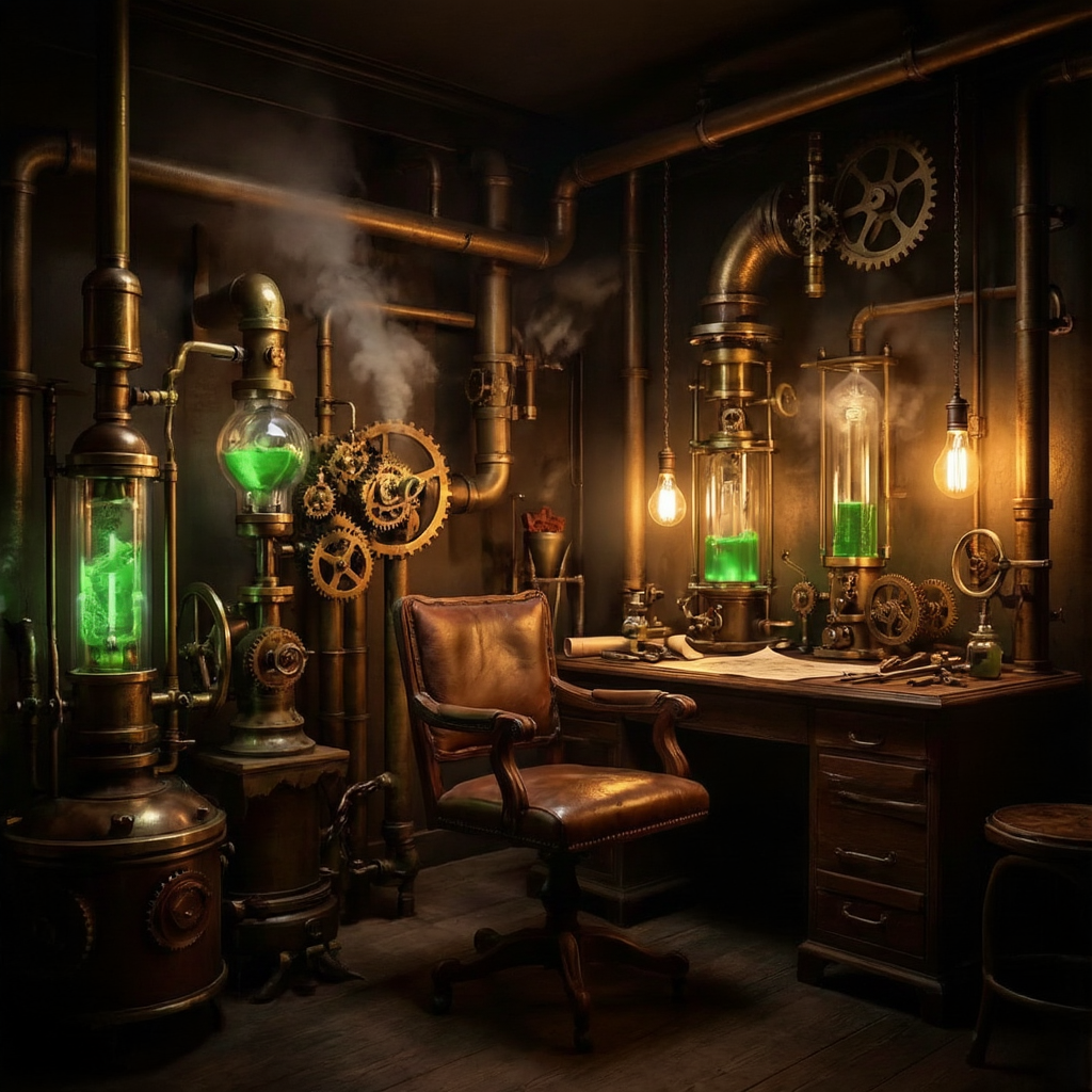 Interior of a Victorian steampunk laboratory. Brass pipes, gears, steam engines, and glass vacuum tubes filled with glowing green liquid. A vintage leather chair and a desk covered with blueprints and tools. Warm tungsten lighting from Edison bulbs. Atmospheric steam and dust motes. Detailed clutter, maximalist aesthetic. 8k photorealistic render.叙事解析: