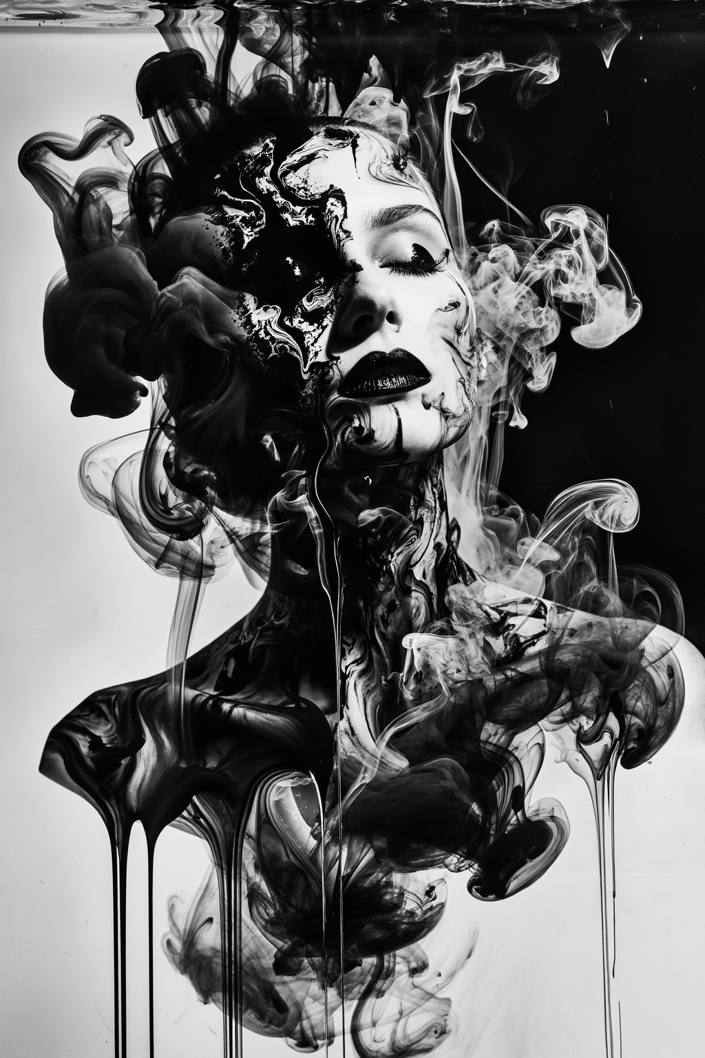 Abstract artistic portrait formed by swirling black ink and white smoke in water. The silhouette of a woman's face emerges from the chaotic fluids. Double exposure effect. High contrast black and white photography. Fluid motion, dissolving edges, surreal, hauntingly beautiful. Macro details of ink dispersion. 8k resolution.叙事解析: