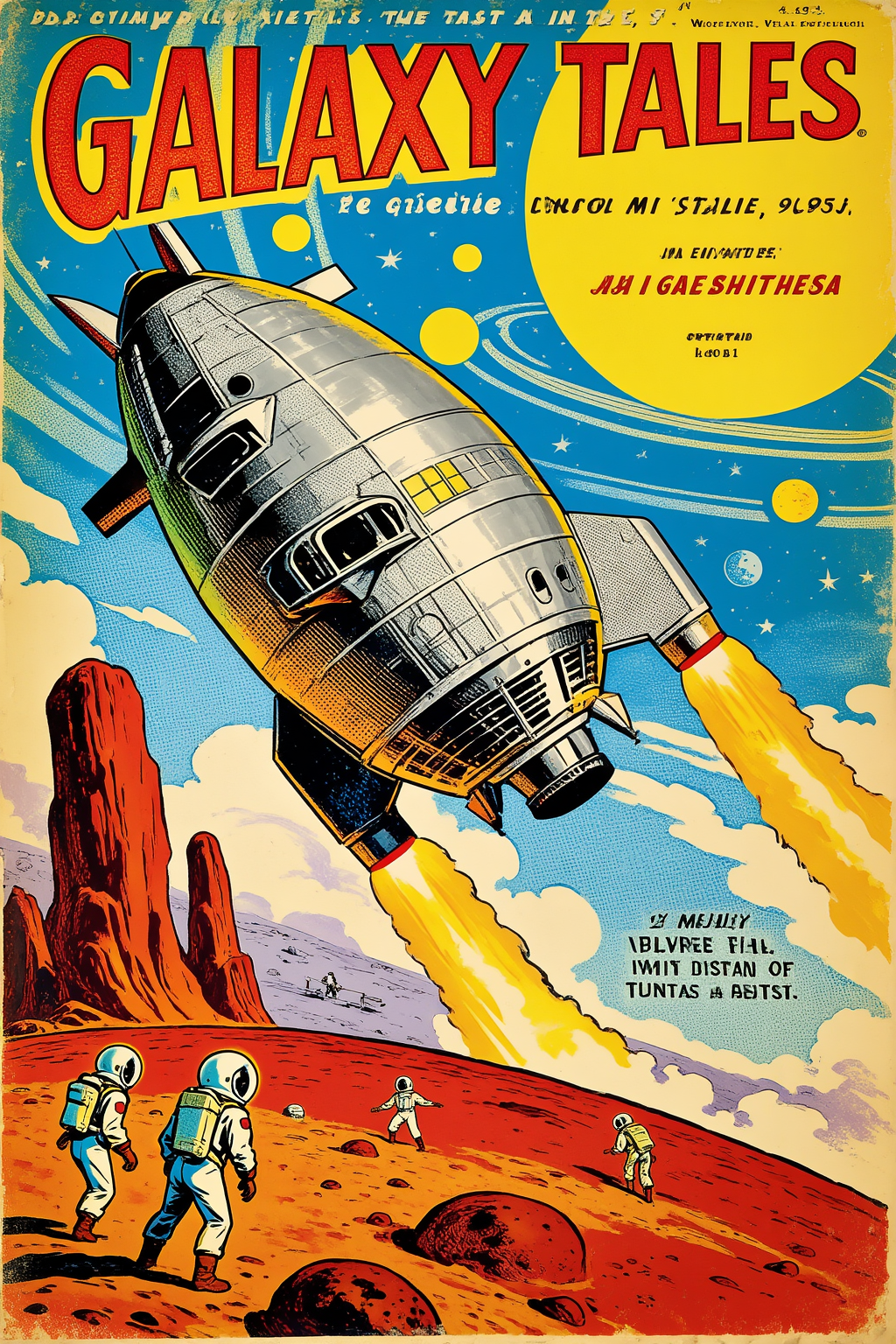 Vintage 1950s sci-fi pulp magazine cover art. A sleek silver rocket ship landing on a red alien planet. Astronauts in bubble helmets exploring. Giant ringed planets and stars in the background. Retro-futuristic style, bold colors, halftone print texture, distressed paper effect. Dramatic composition, sense of wonder and adventure. 'GALAXY TALES' title text at the top (optional).叙事解析: