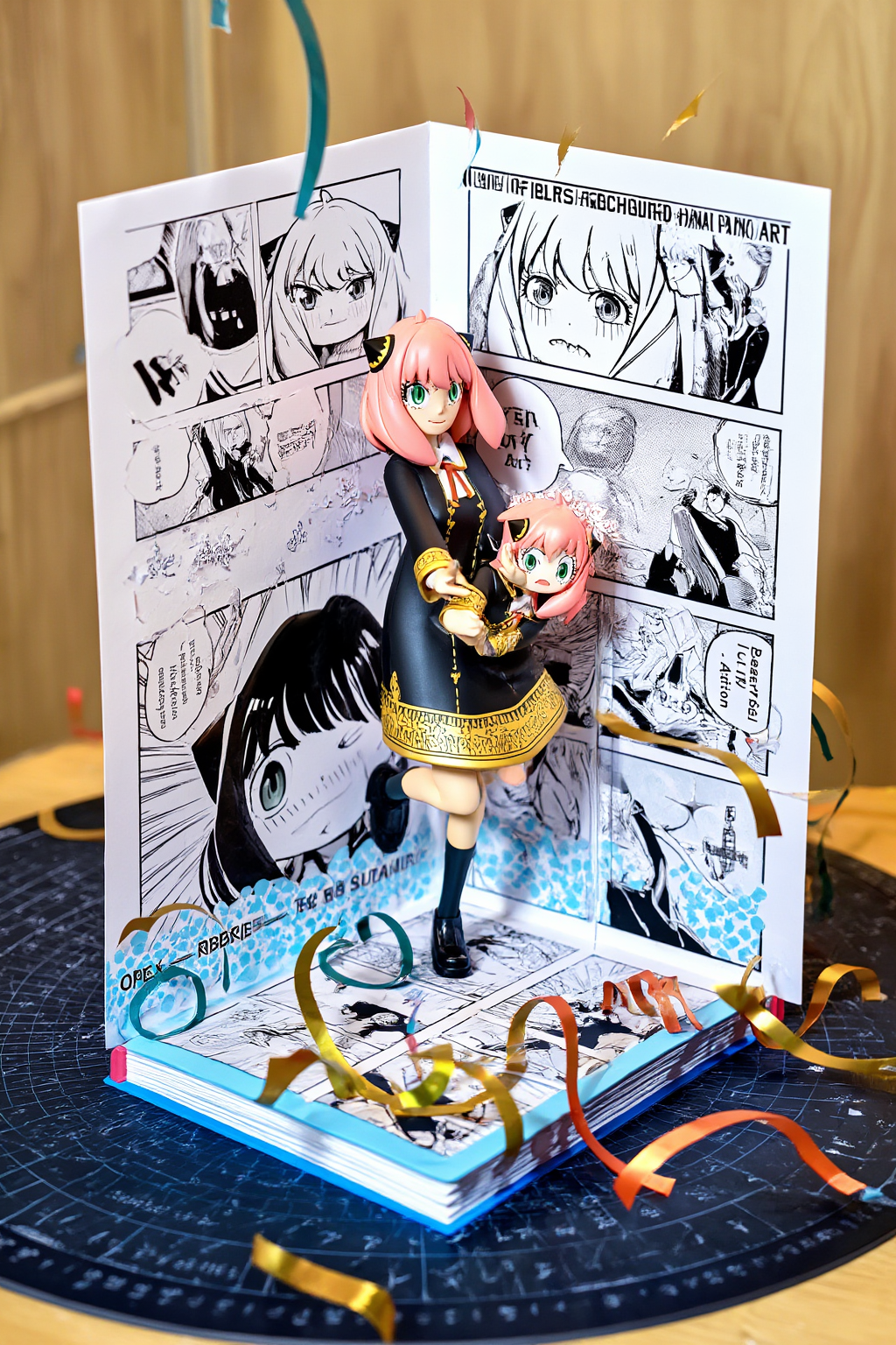 manga <Becky Blackbell> [ OUT OF FOCUS LIBRARY BACKGROUND ] [ VERTICAL MANGA PANEL ART ] [ (Friendship Scene from Spy x Family) ] | [ 3D Becky Blackbell JUMPING OUTWARD ] [ (Cheer Pose, Dynamic Action) ] | [ OPEN BOOK / RIBBON CONFETTI / CLASS BASE ] [ (Infer based on Spy x Family) ] [ TABLE SURFACE ] INSTRUCTION: Render as a high-end Pop-Up Book aesthetic. The Background is flat paper. The Character is full 3D plastic/resin. Lighting: Toy Photography style (Softbox, vibrant colors).Negative Prompt